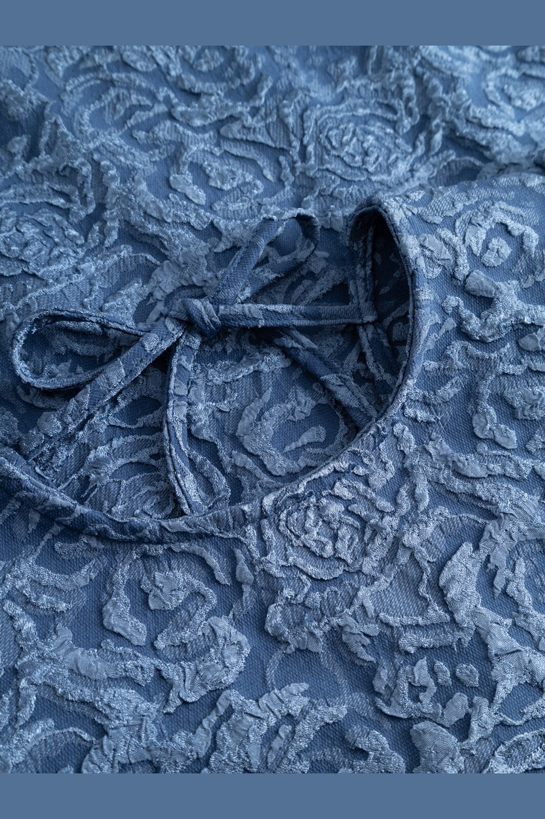 Lång klänning från Noella i dimblått med blommönster. Klänningen är gjord av jacquardtyg med en struktur som ger tyget djup.