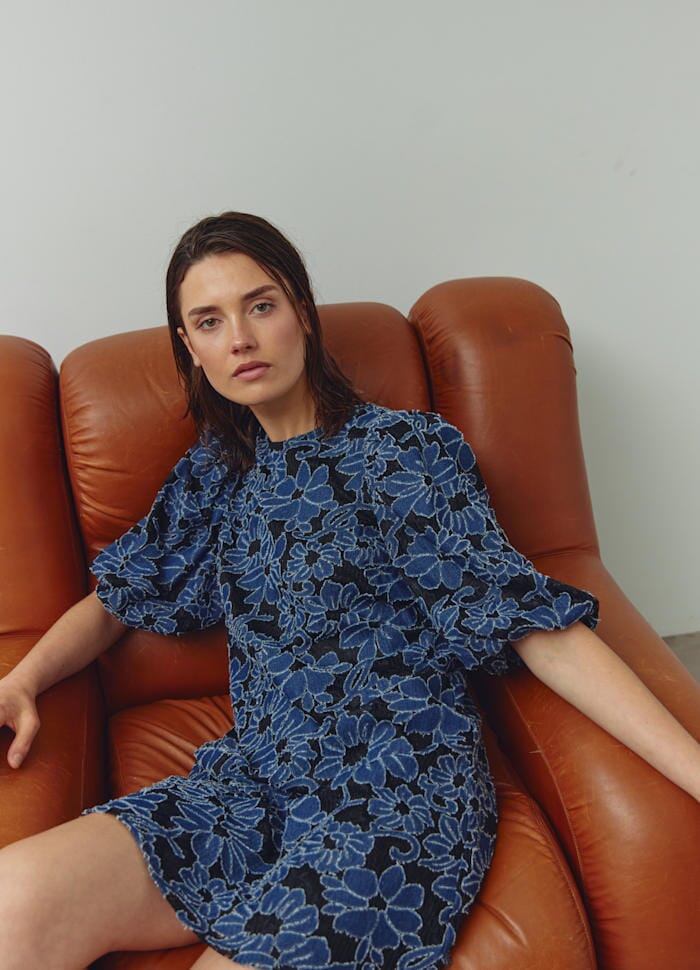 Kort klänning från Noella med blått och svart blommönster. Klänningen har broderi, spets och snörningsdetaljer och går till låret.