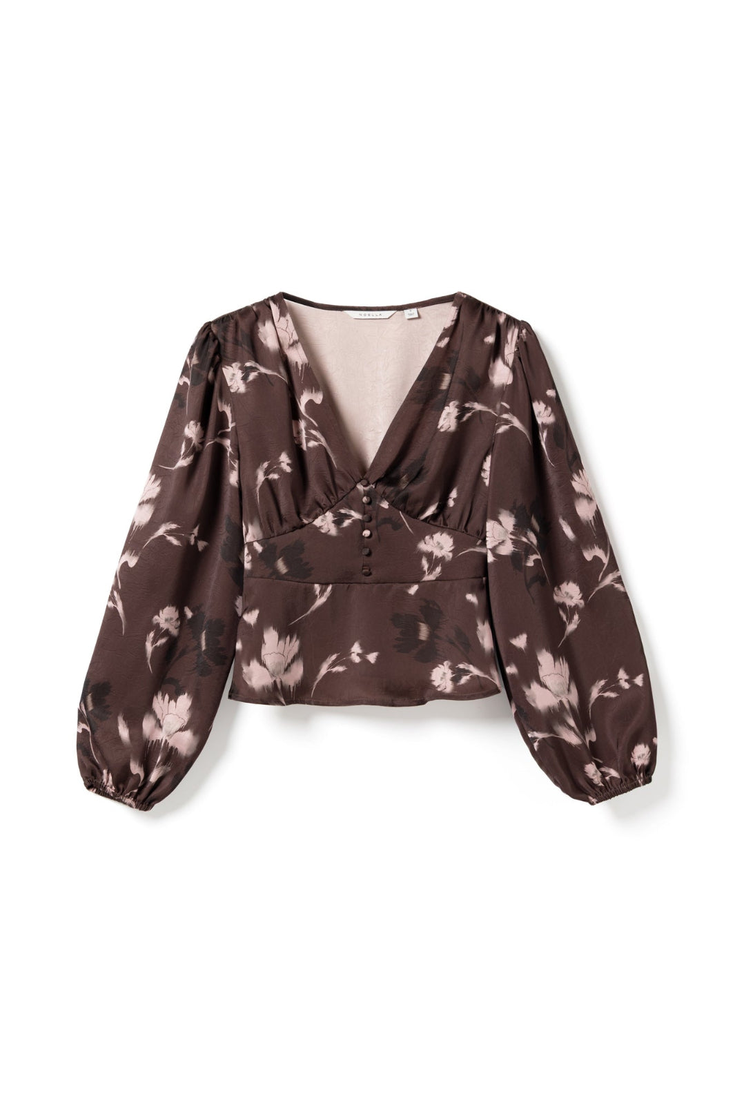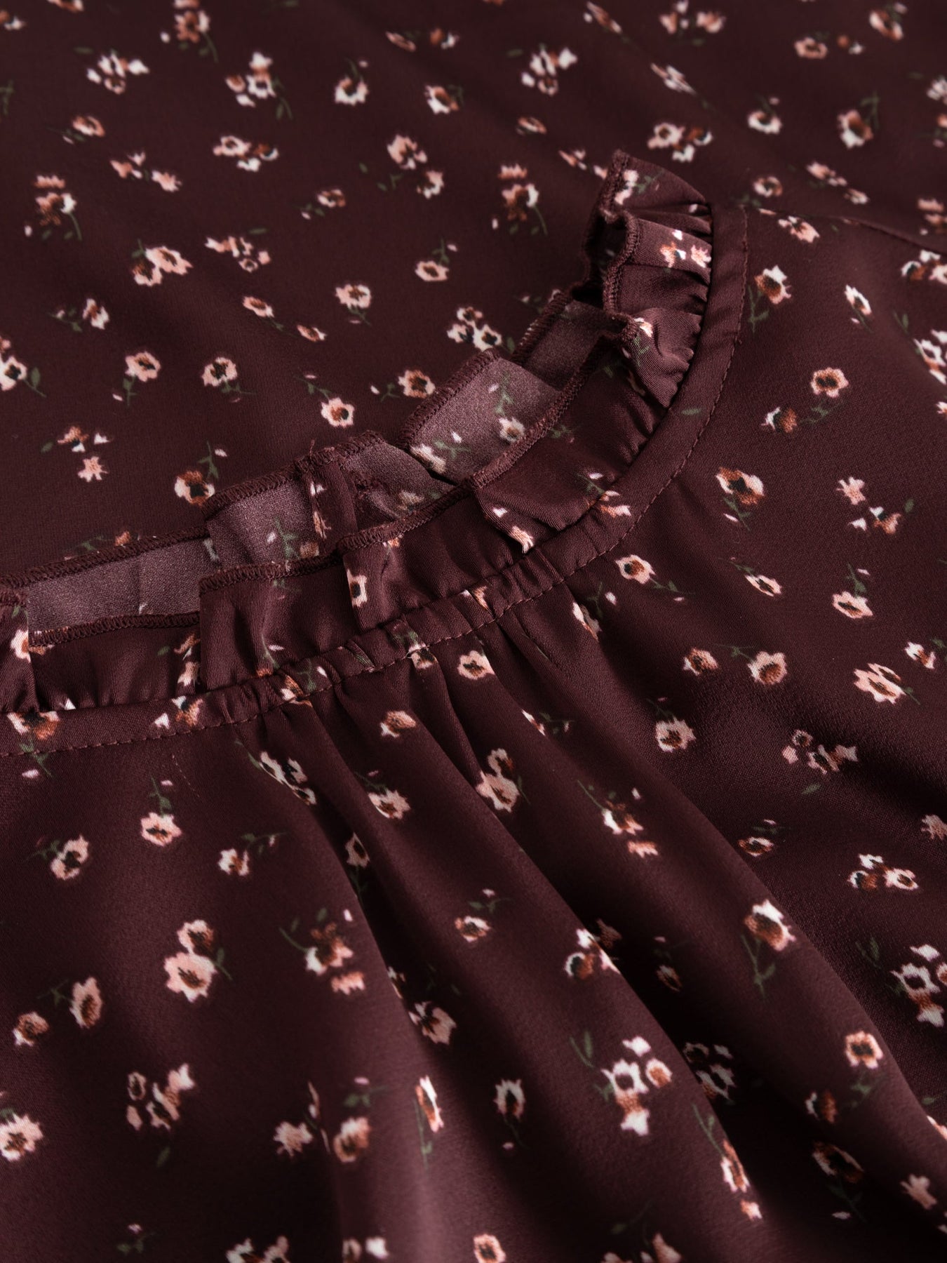 Klänning från Noella i djup burgundy med ett blommönster i rosa och röda nyanser. Klänningen har korta puffärmar och en hög halsringning med volangkrage.