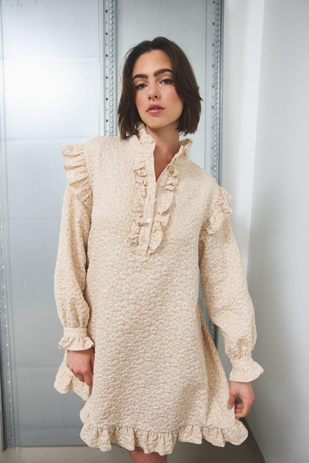 Klänning från Noella i en ljus oysterfärg med blommönster. Den har hög hals med volanger, knappar fram och långa ärmar med volangkanter. Klänningen avslutas med en volangkant nertill.