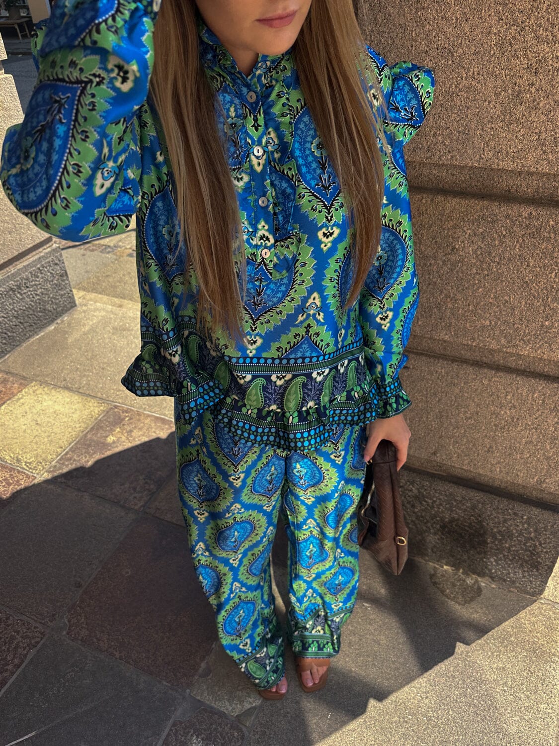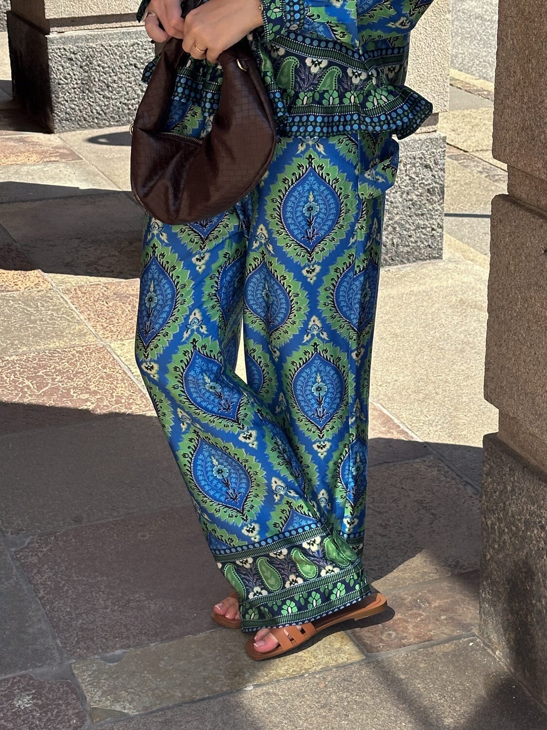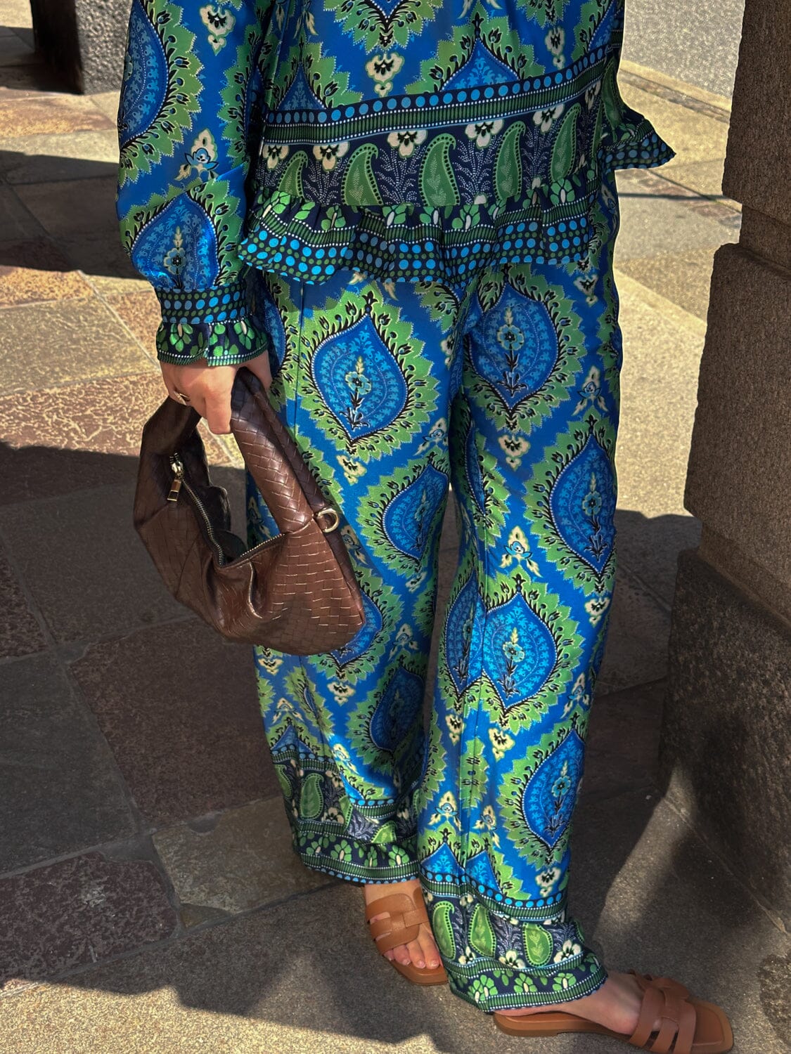 Byxor från Noella med ett blågrönt paisleymönster. Byxorna har en dekorativ kant nederst och ett snöre i midjan som gör det möjligt att justera passformen.