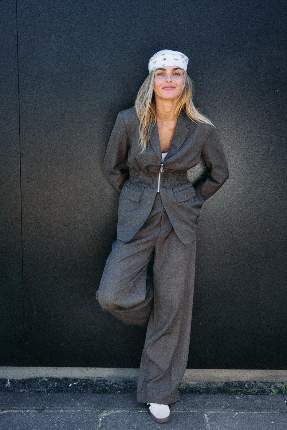 Brun blazer från Noisy May med smock-detalj i midjan. Den slanka passformen har V-ringning och långa ärmar. Blazern stängs med dragkedja framtill och har två ficklock.