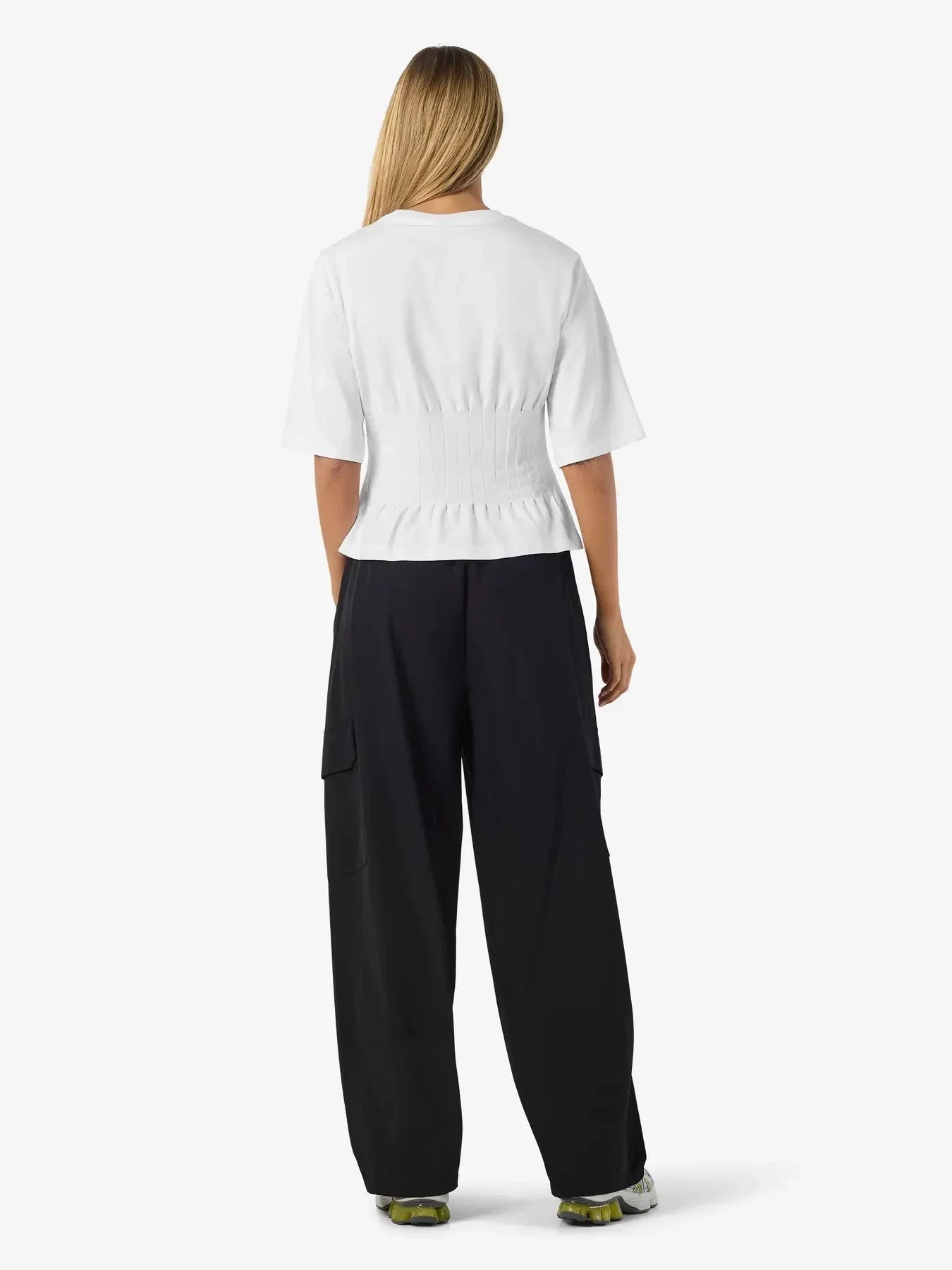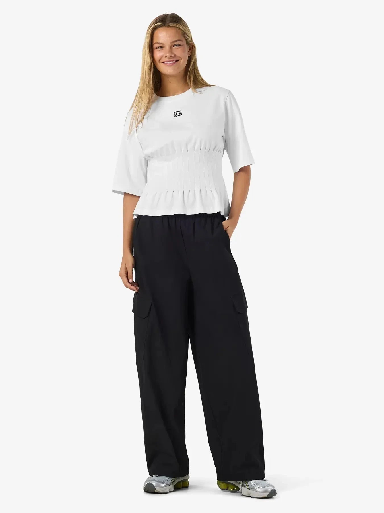 Vit fitted T-shirt från Noisy May med logotyp på bröstet. T-shirten har en skärningslinje i midjan med volanger.