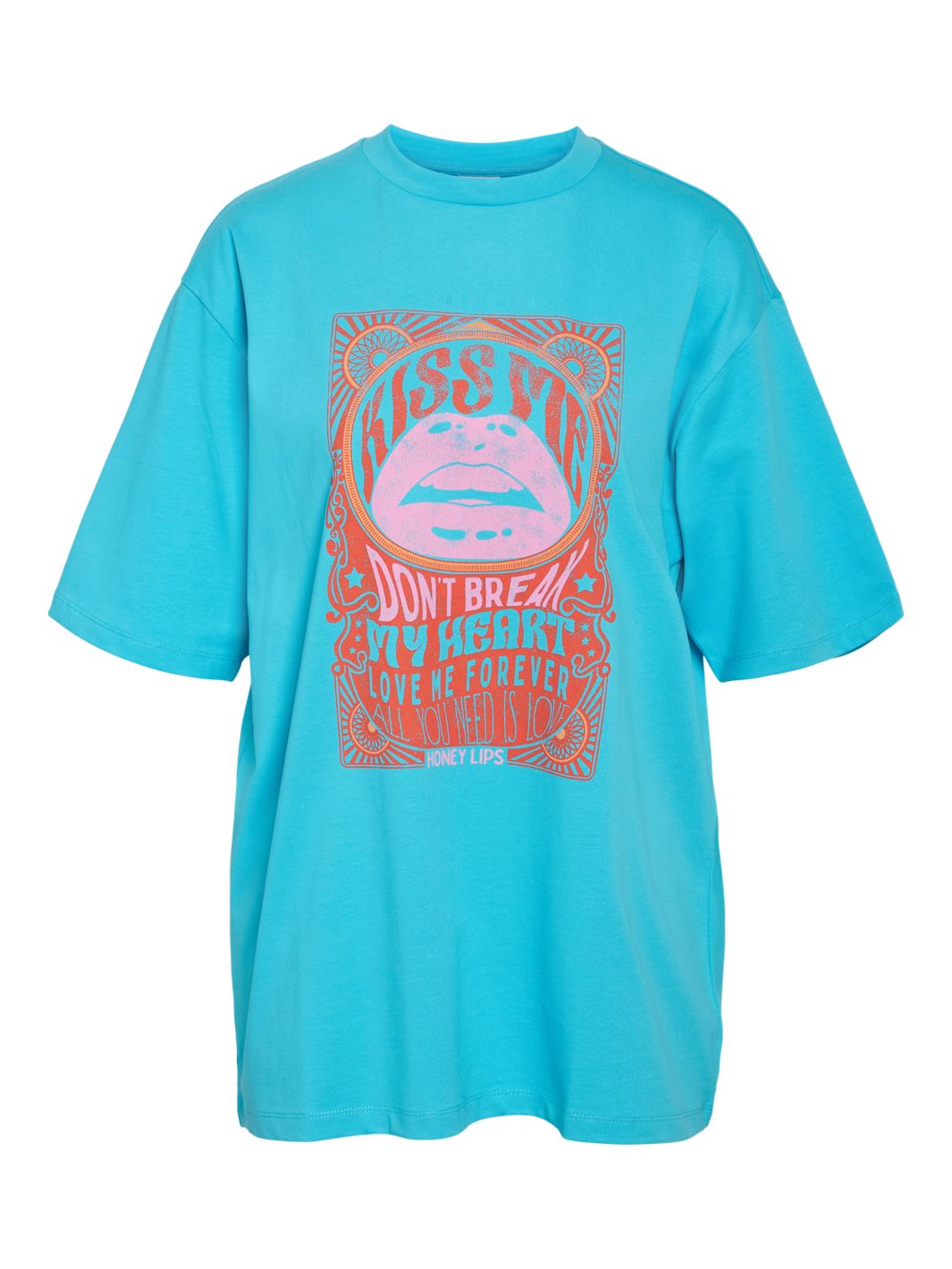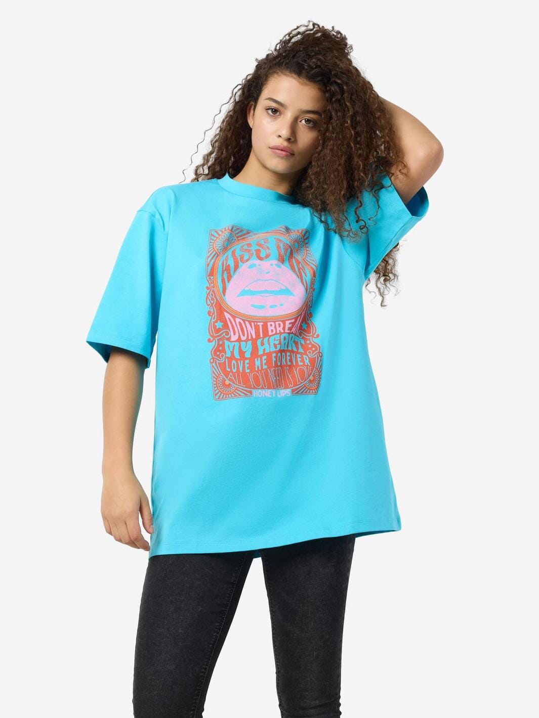 T-shirt från Noisy May i turkos med ett retroinspirerat grafiskt tryck på framsidan. Den har en lös, oversized passform och en rund halsringning.