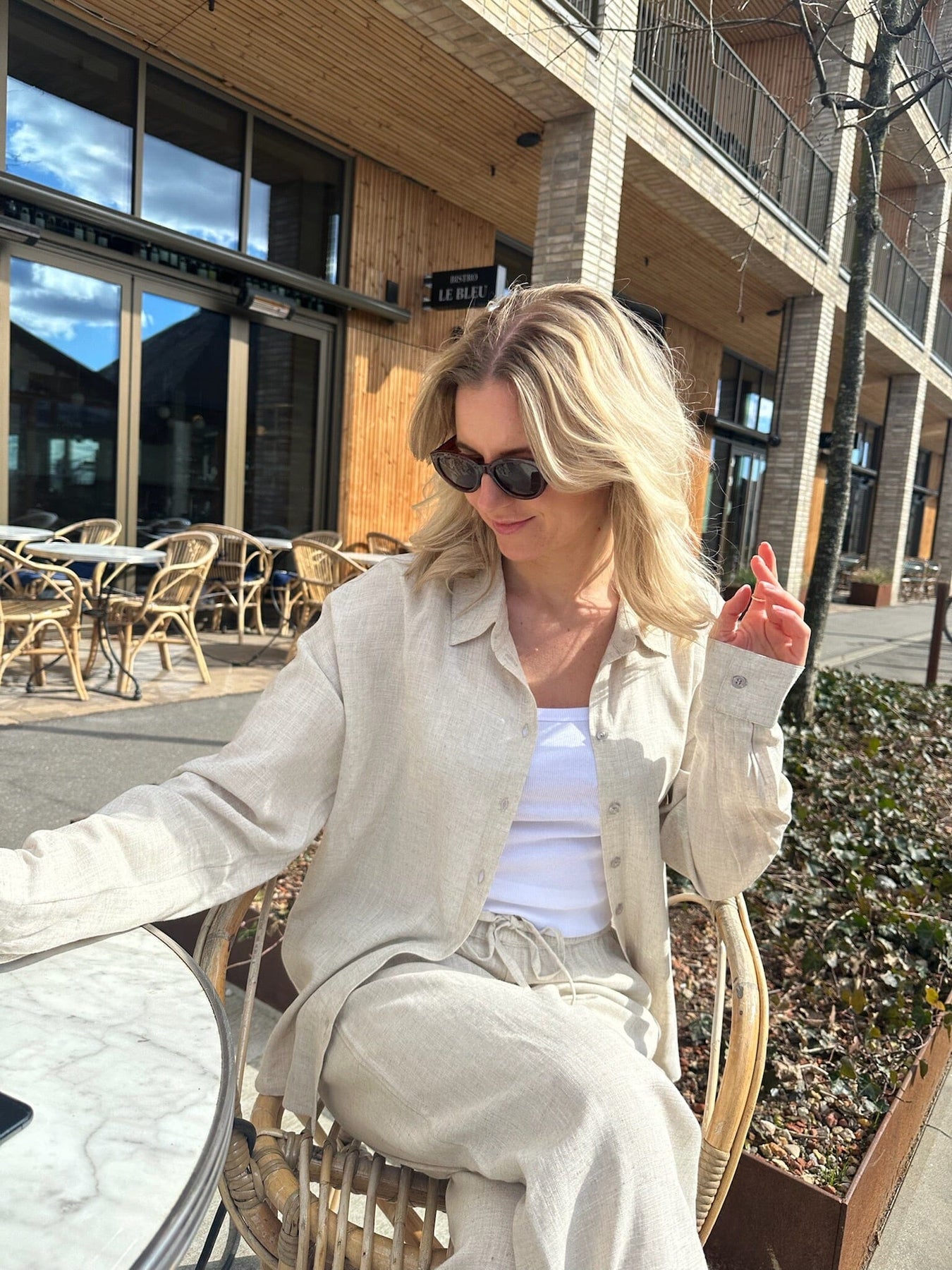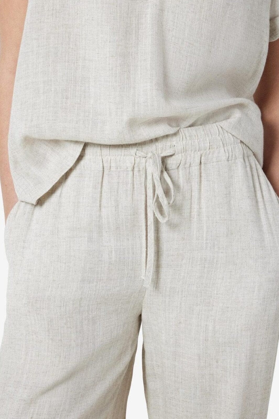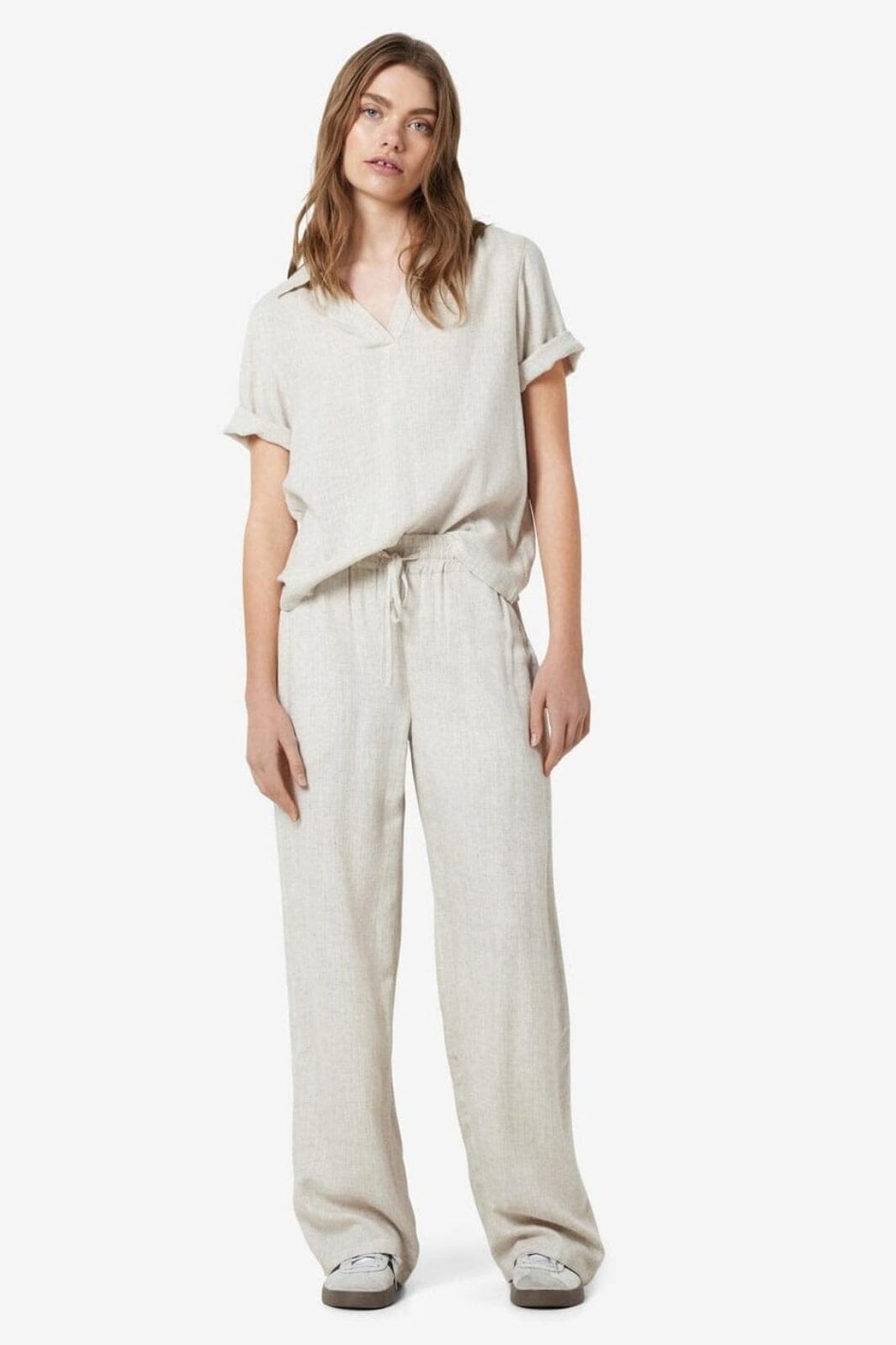 Avslappnade byxor från Noisy May i en beige nyans. Byxorna är tillverkade av en mjuk viskos-linblandning med snörning och elastik i midjan. Den avslappnade passformen ger god rörelsefrihet.