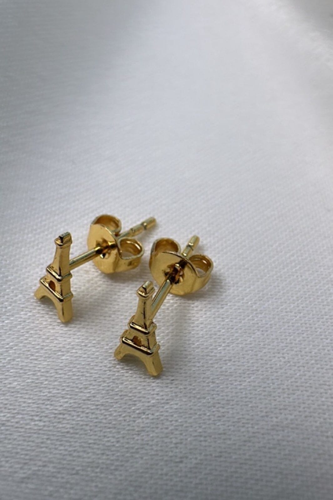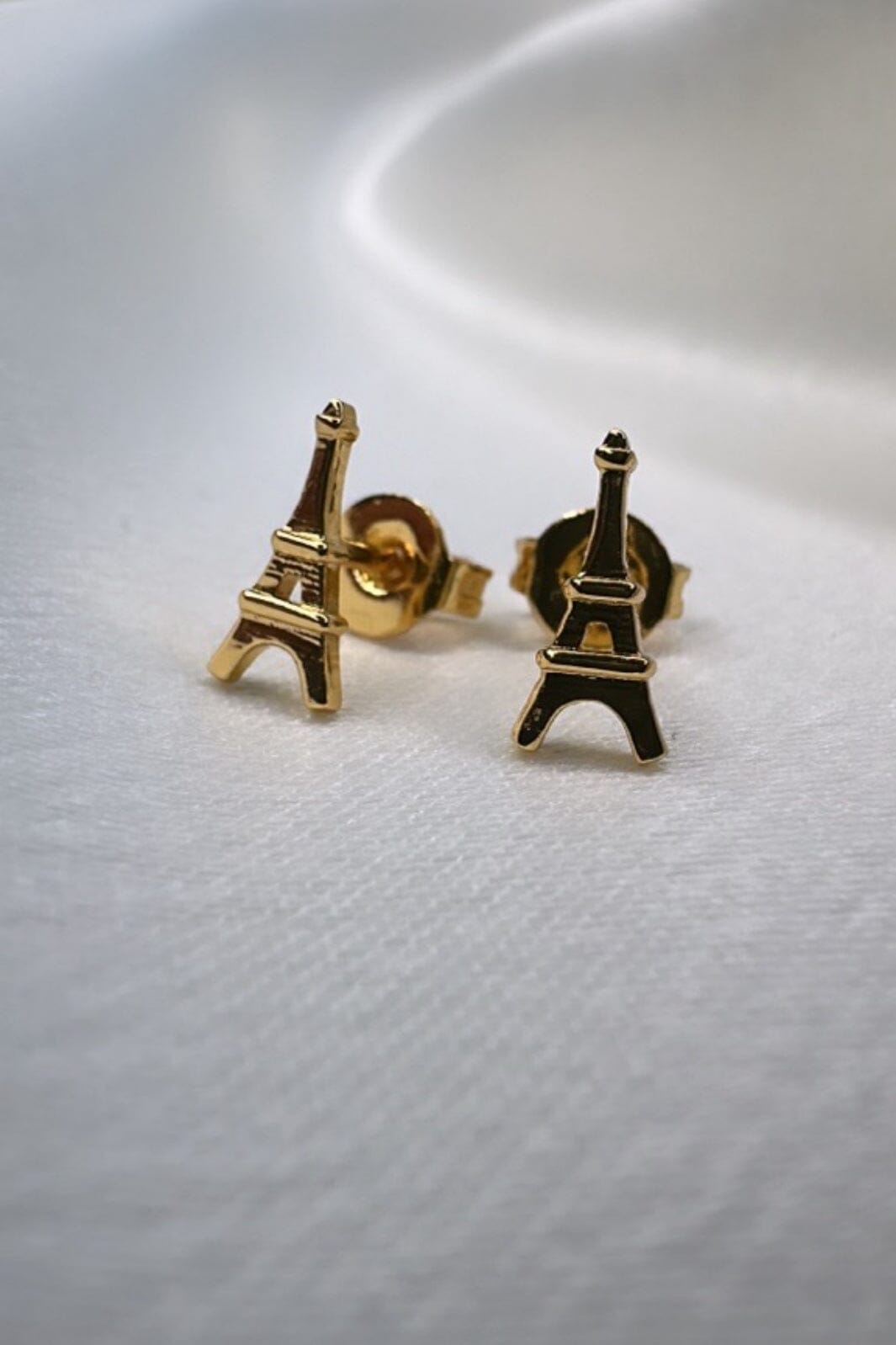 Guldpläterade örhängen från O element formade som Eiffeltornet. De små örhängena har en detaljerad utformning av det ikoniska tornet i en gyllene ton.