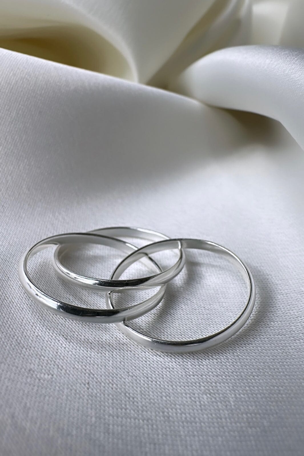 Försilvring ring från O element med tre sammanlänkade ringar. Ringen är tillverkad av mässing med en blank silveryta som skapar en ren och minimalistisk design.