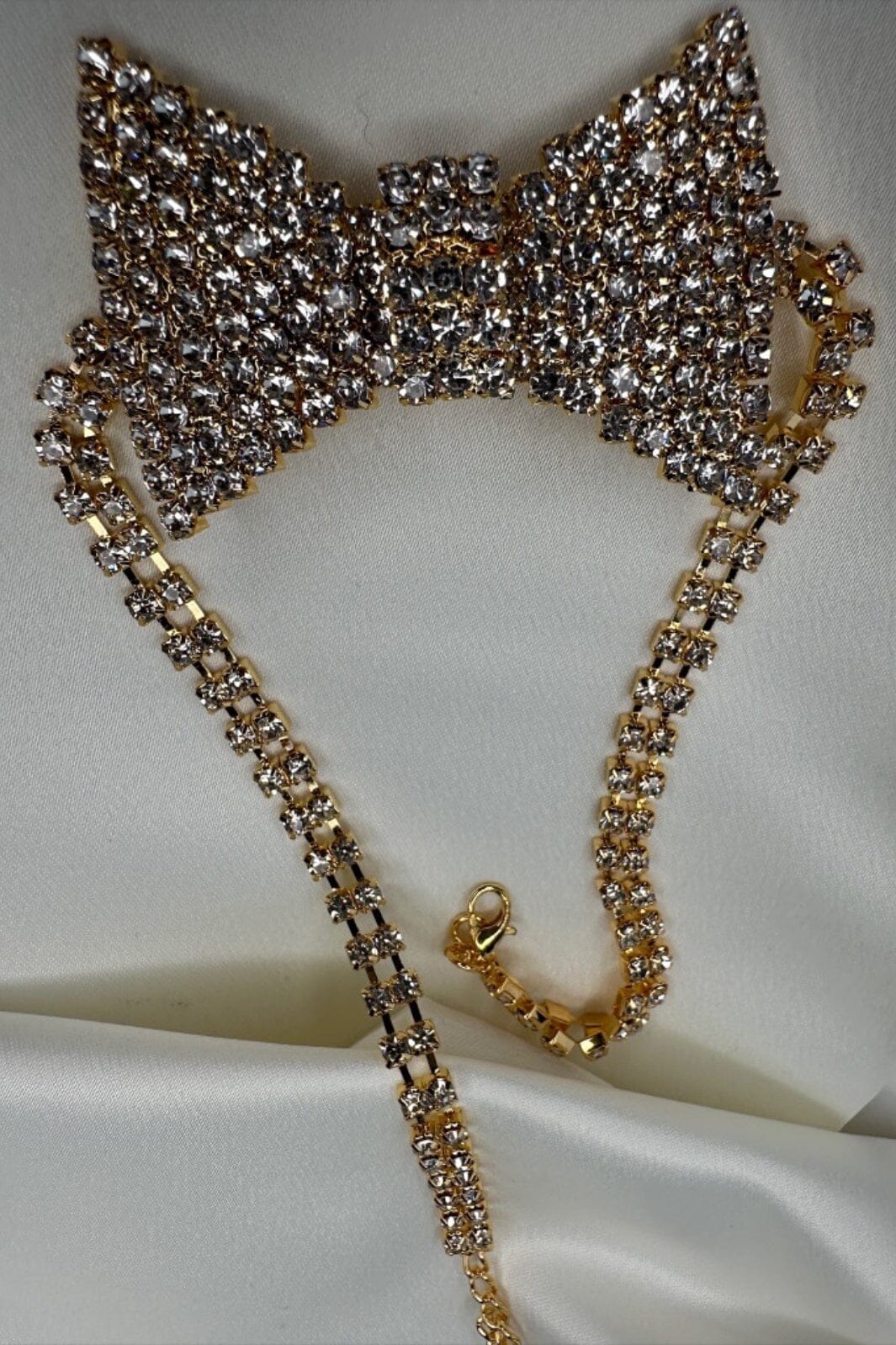 Guldpläterad halsband från O element med en sløyfe i fjärilsform. Sløyfen är prydd med små glittrande stenar och har en gyllene finish som skapar ett fint uttryck.