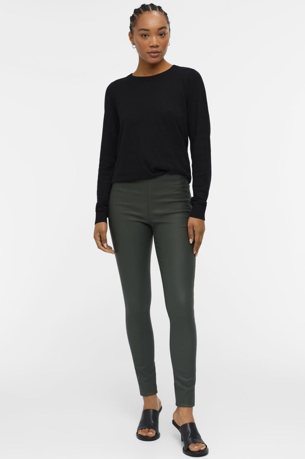 Coated leggings från Object i en mörkgrön färg. De har en skinny passform och en blank yta som påminner om läder.