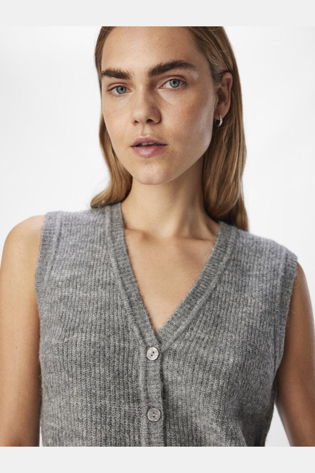 Grå stickad väst från Object med V-hals och knappstängning. Vesten har en ribbad struktur och en ärmlös design som gör den lämplig för lager-på-lager-klädsel.