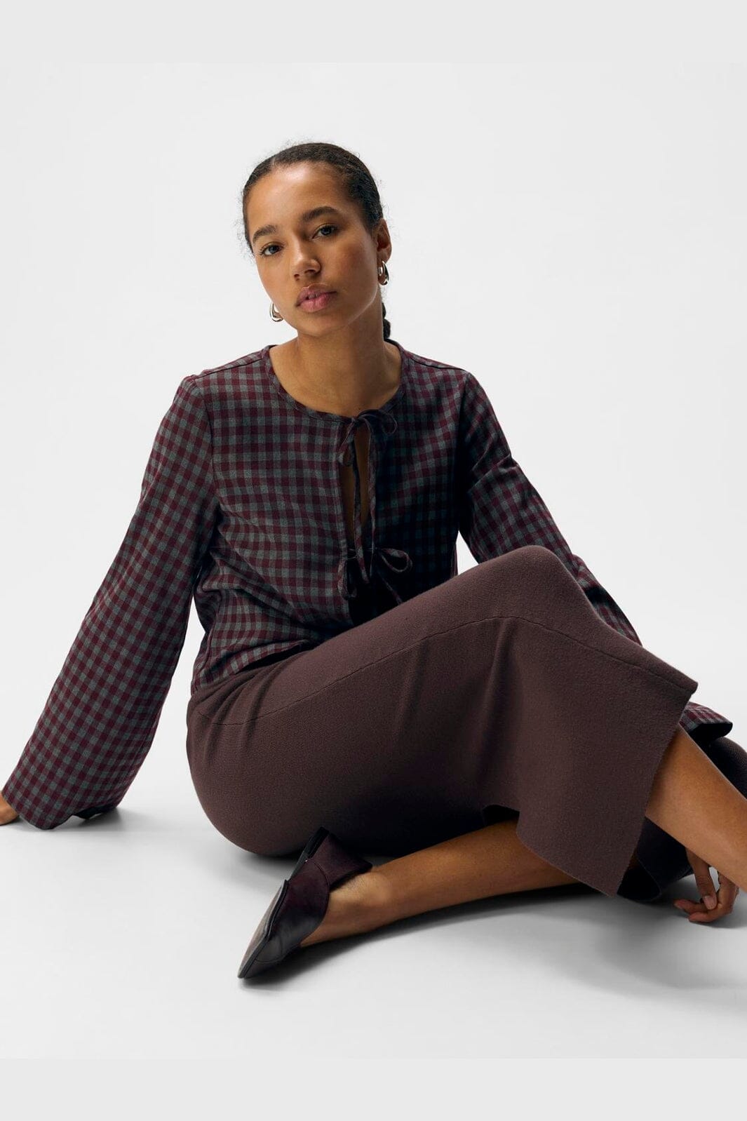 Brun stickad kjol från Object i medellång längd. Kjolen har en figurnära passform och går till mitt på vaden. Den elastiska midjan och slitsen bak ger god rörelsefrihet.