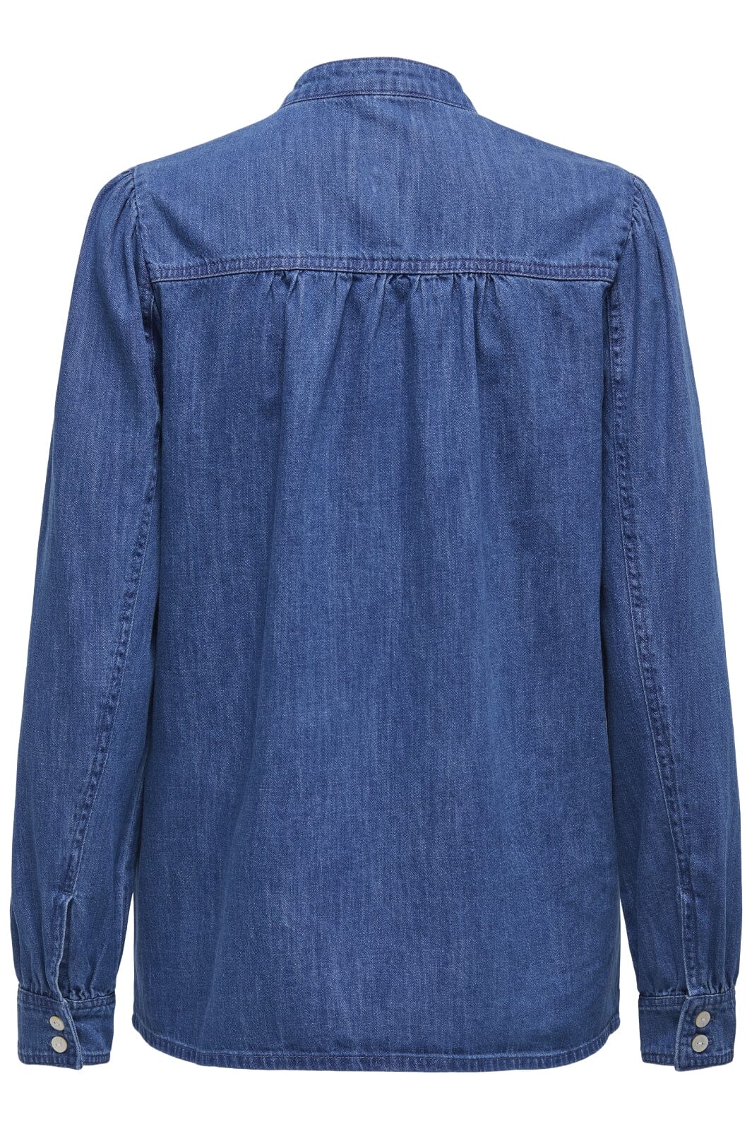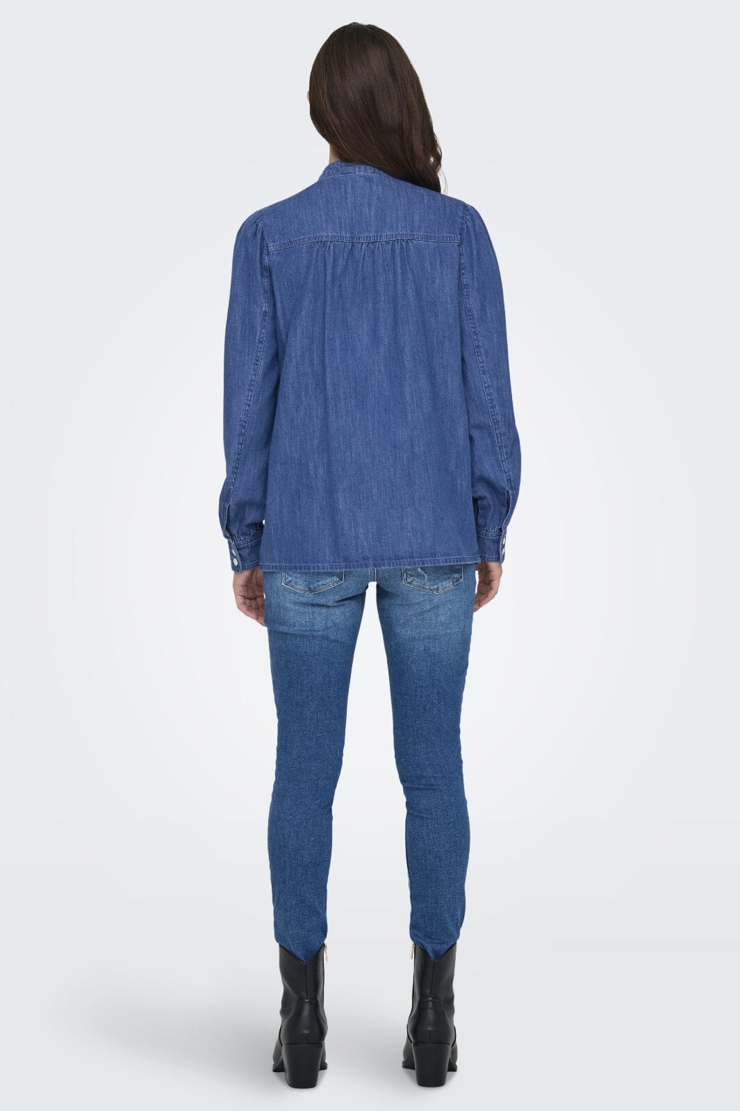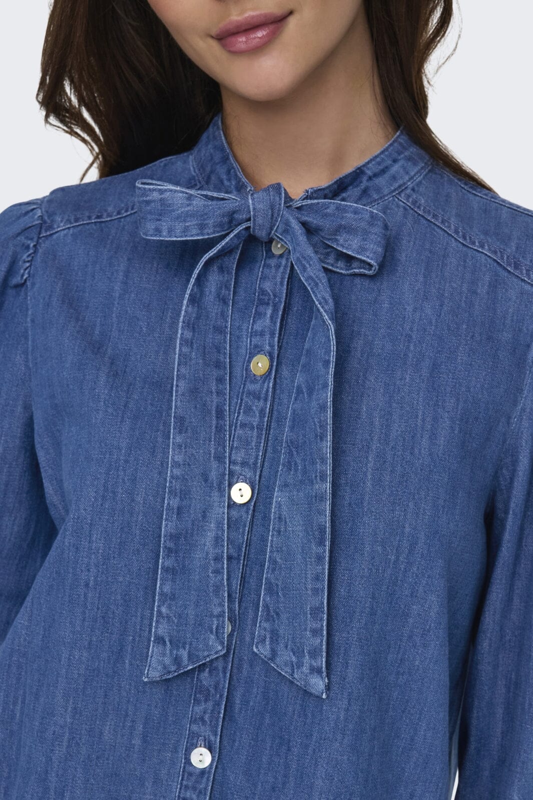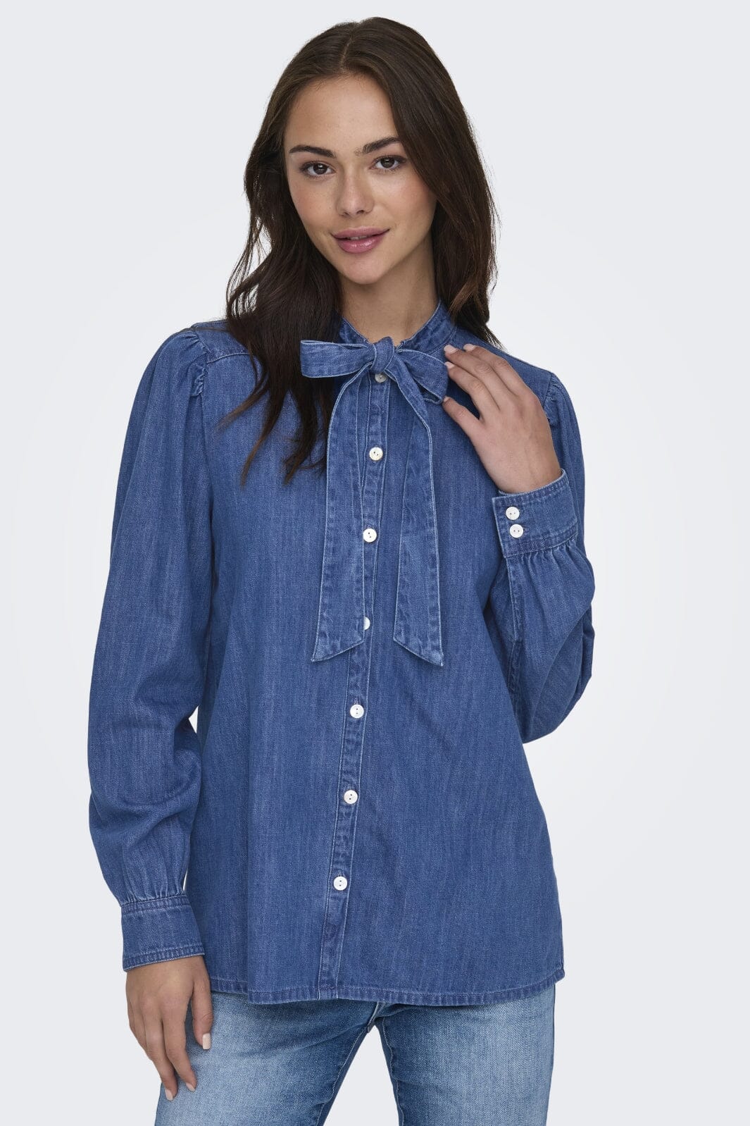 Mellanblå denimskjorta från Only med en rosett vid halsen. Skjortan har en klassisk skjortkrage och långa ärmar med manschetter som kan knäppas.