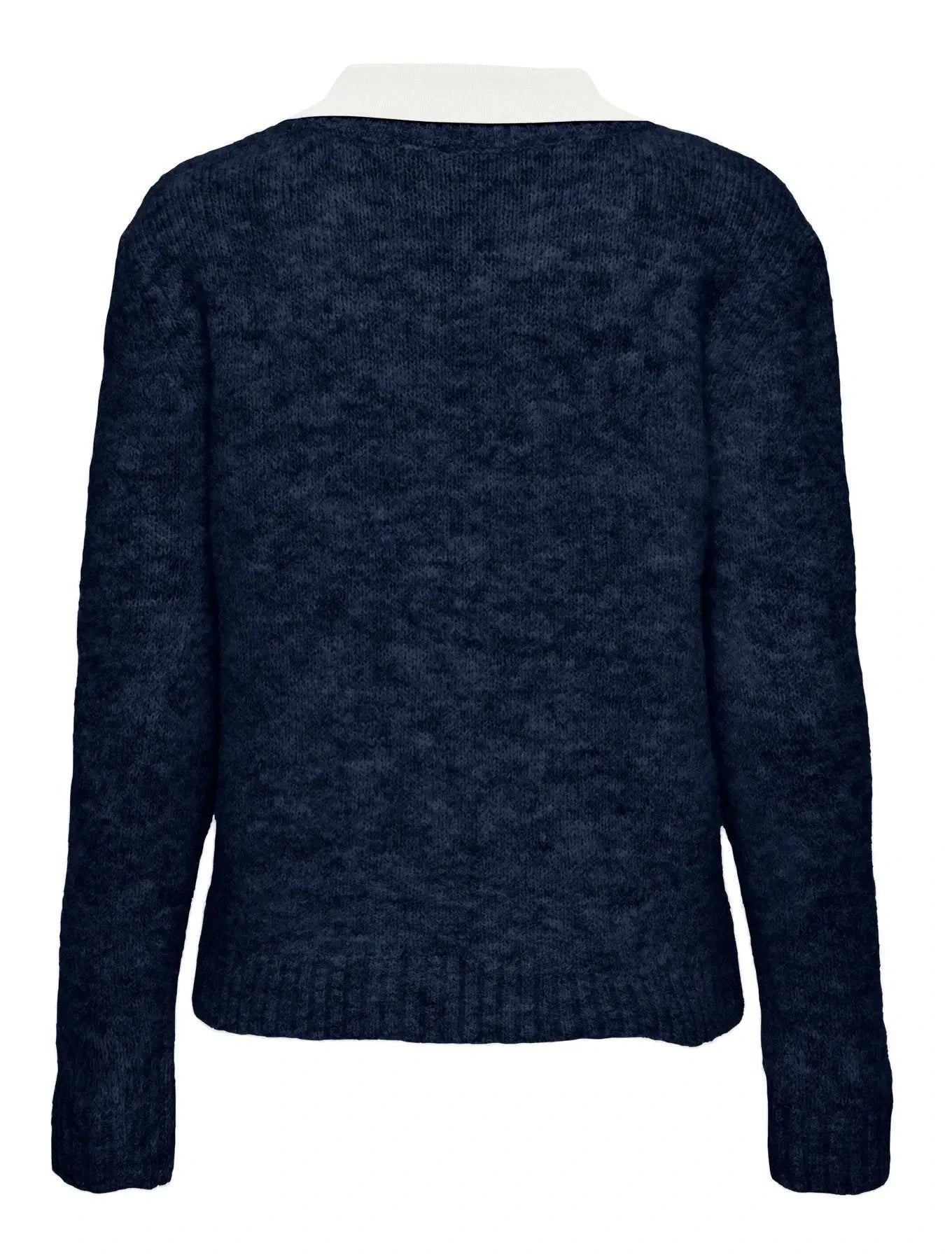 Mörkblå melerad stickad tröja från Only med en kontrastfärgad vit polokrage. Tröjan är en pullover i flatstickning med långa ärmar och en lös passform.