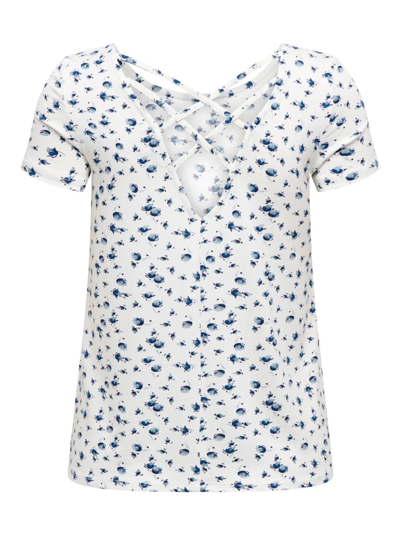 Kortärmad topp från Only med blått blommönster på vit bakgrund. Toppen har regular fit-passform och korsade snören i ryggen.