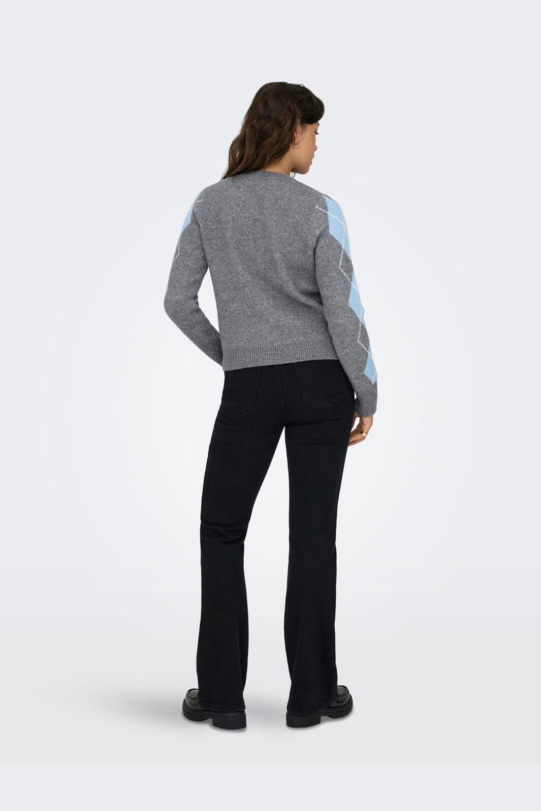 Grå cardigan från Only med argyle-mönster i ljusblått och grått. Stickad i en blandning av återvunnen polyester, akryl, ull och elastan med knappstängning och rund halsringning.