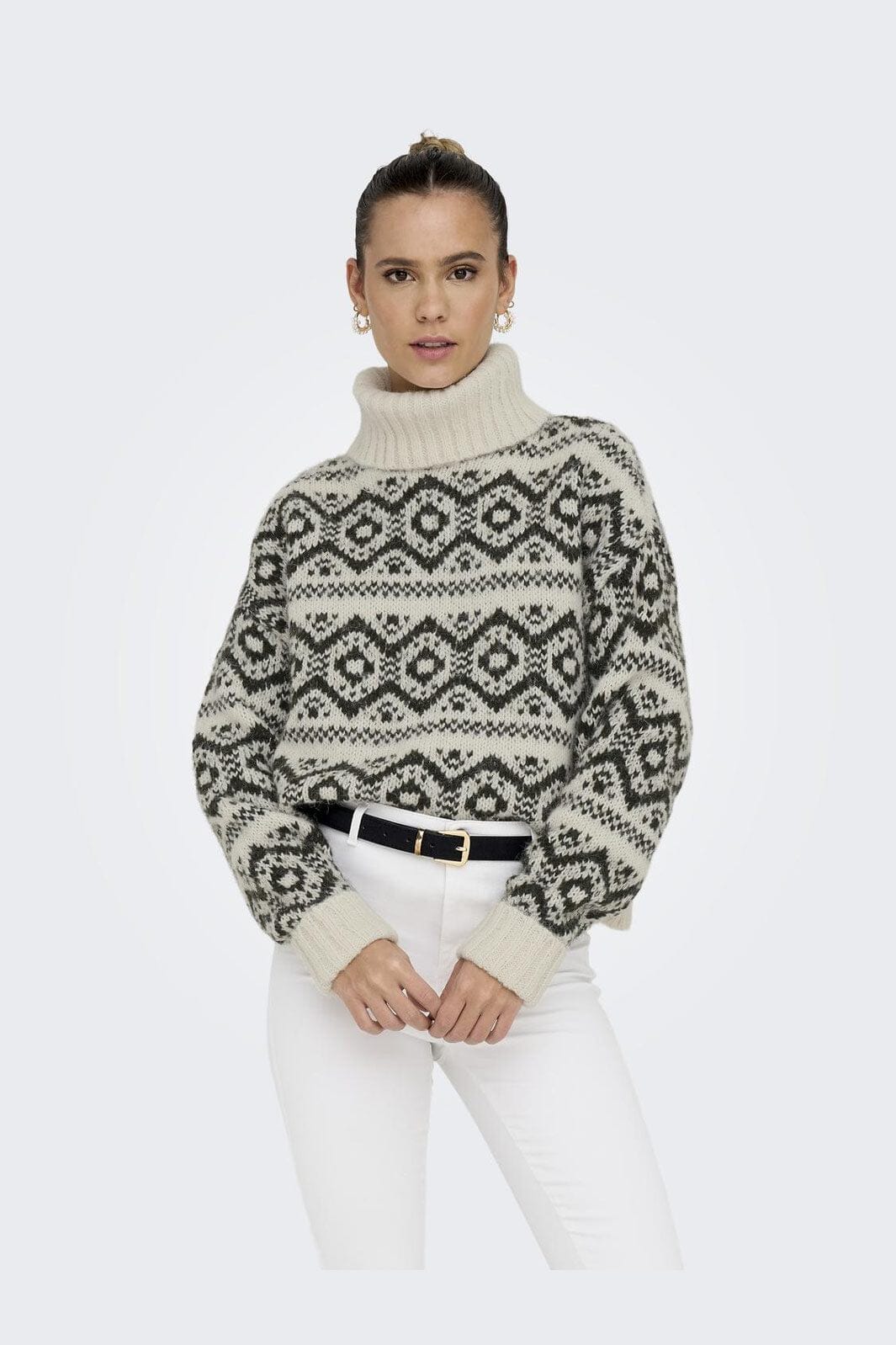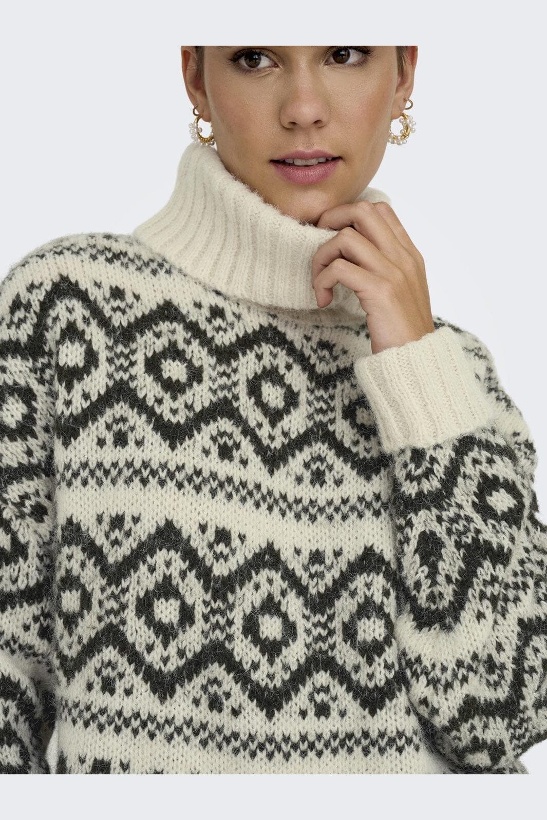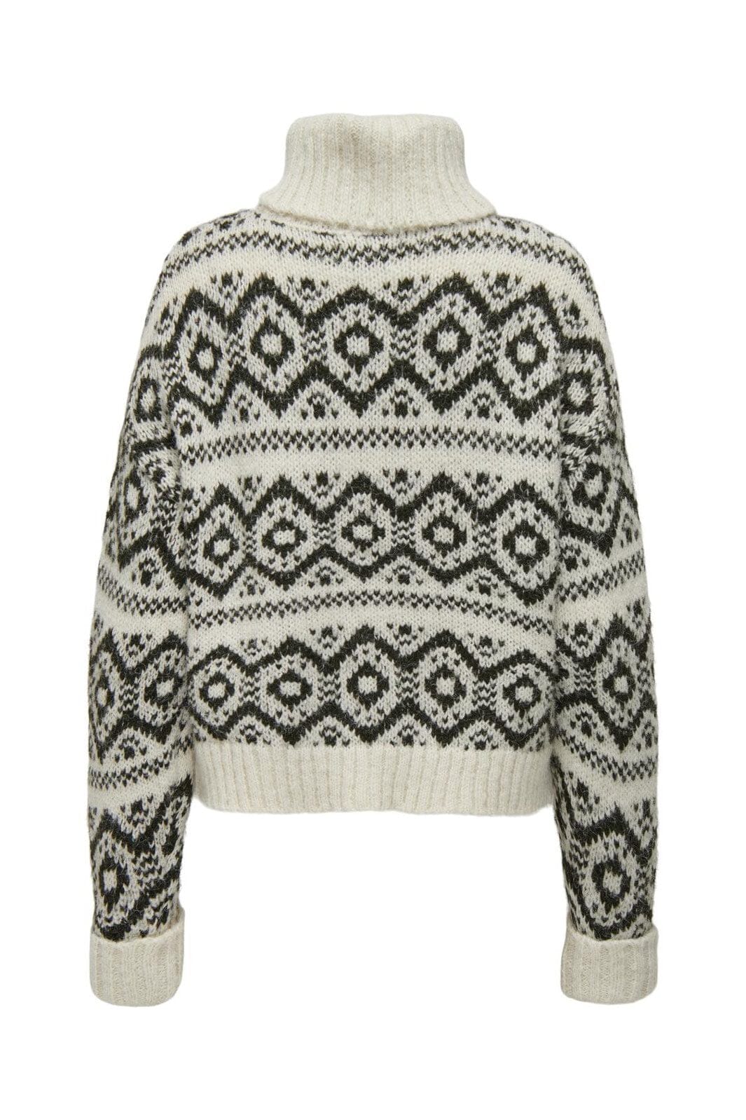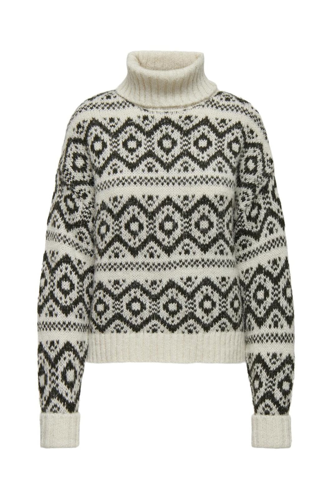 Stickad tröja från Only med geometriskt mönster i björk- och hartsnyanser. Den höga rullkragen och den lösa passformen ger en bra kombination av stil och komfort.