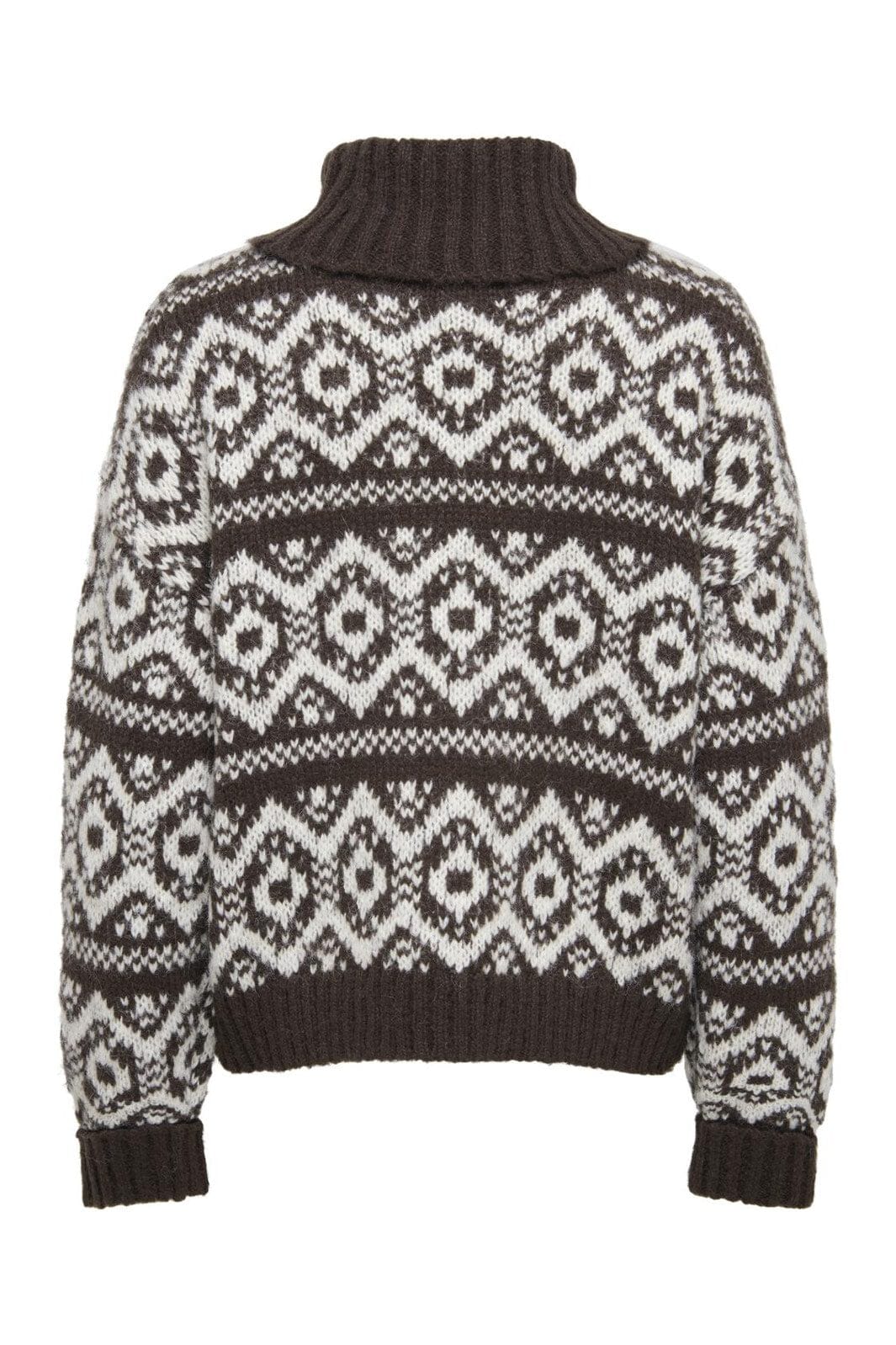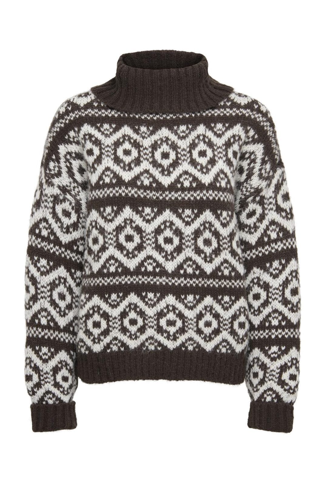 Stickad tröja från Only i mörkbrun med vitt geometriskt mönster. Den har en lös passform med sänkta axlar och en hög rullkrage som ger bra värme för de kalla dagarna.