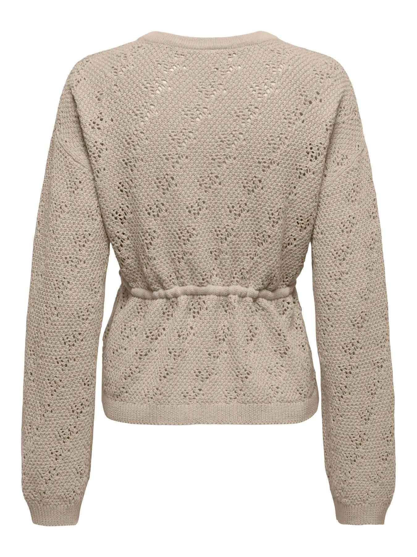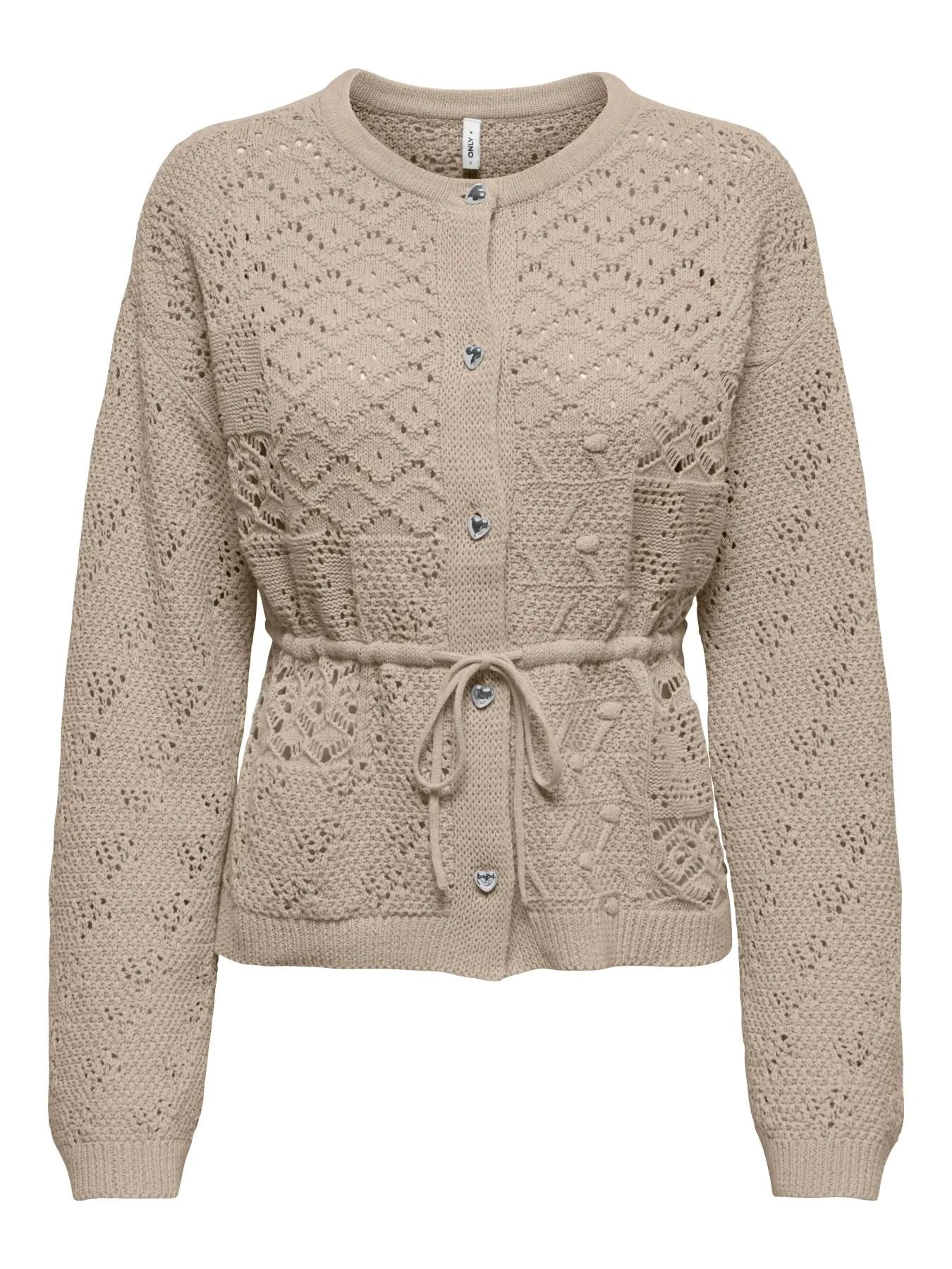 En beige kofta från Only med hjärtformade silverknappar. Koftan är gjord av 70 % återvunnen bomull och 30 % återvunnen polyester i en öppenstickad struktur.