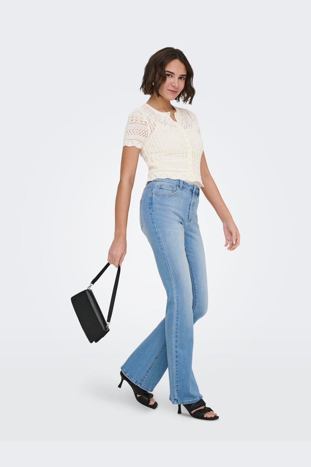 En kofta från Only i ljus cremefärg med pärlknappar och hålmönster. Koftan har korta ärmar och en cropped passform.