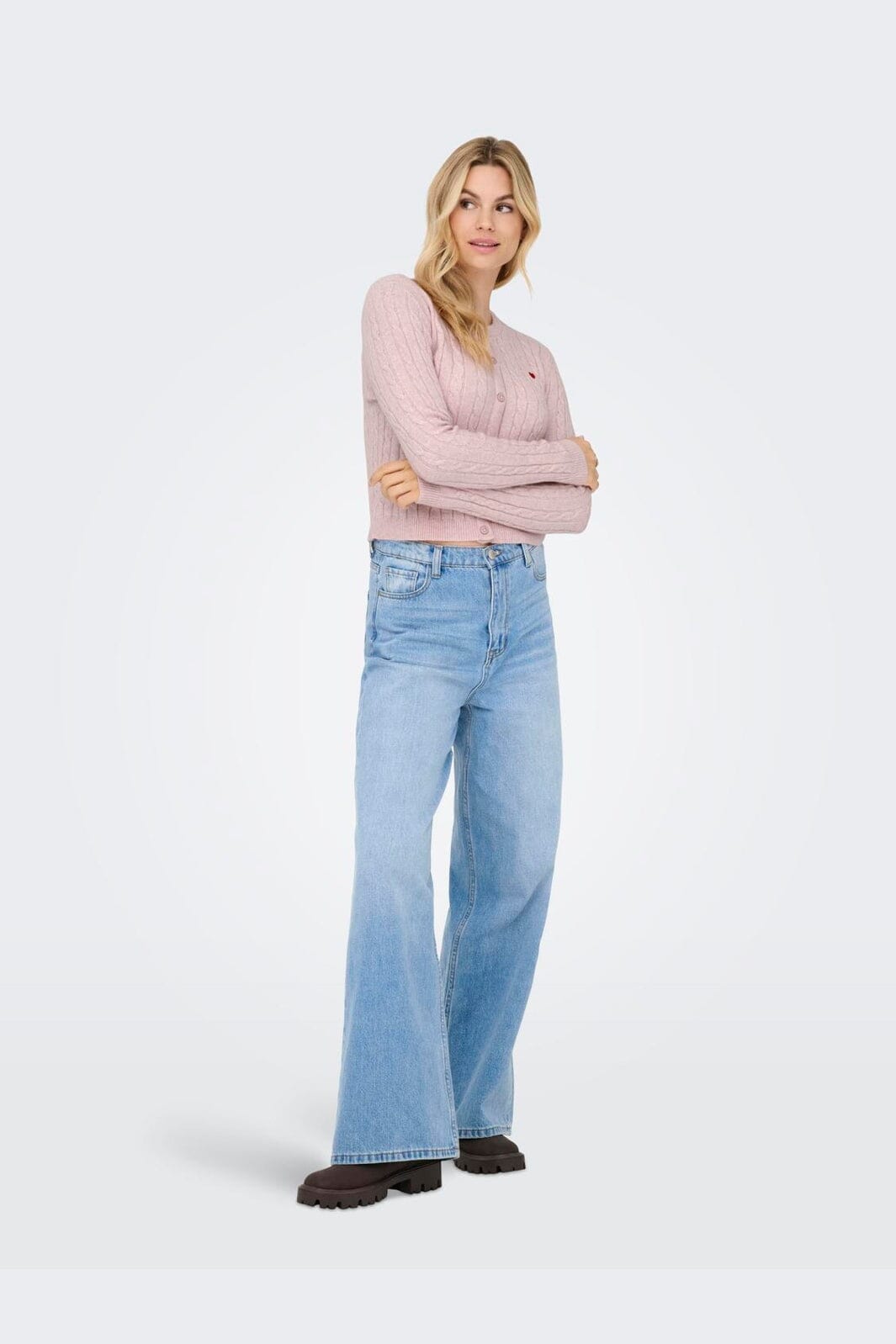 Ljuslila cardigan från Only med kabelstickat mönster och en liten röd hjärtbrodering på bröstet. Cardiganen har knappstängning och ribbstickade manschetter.