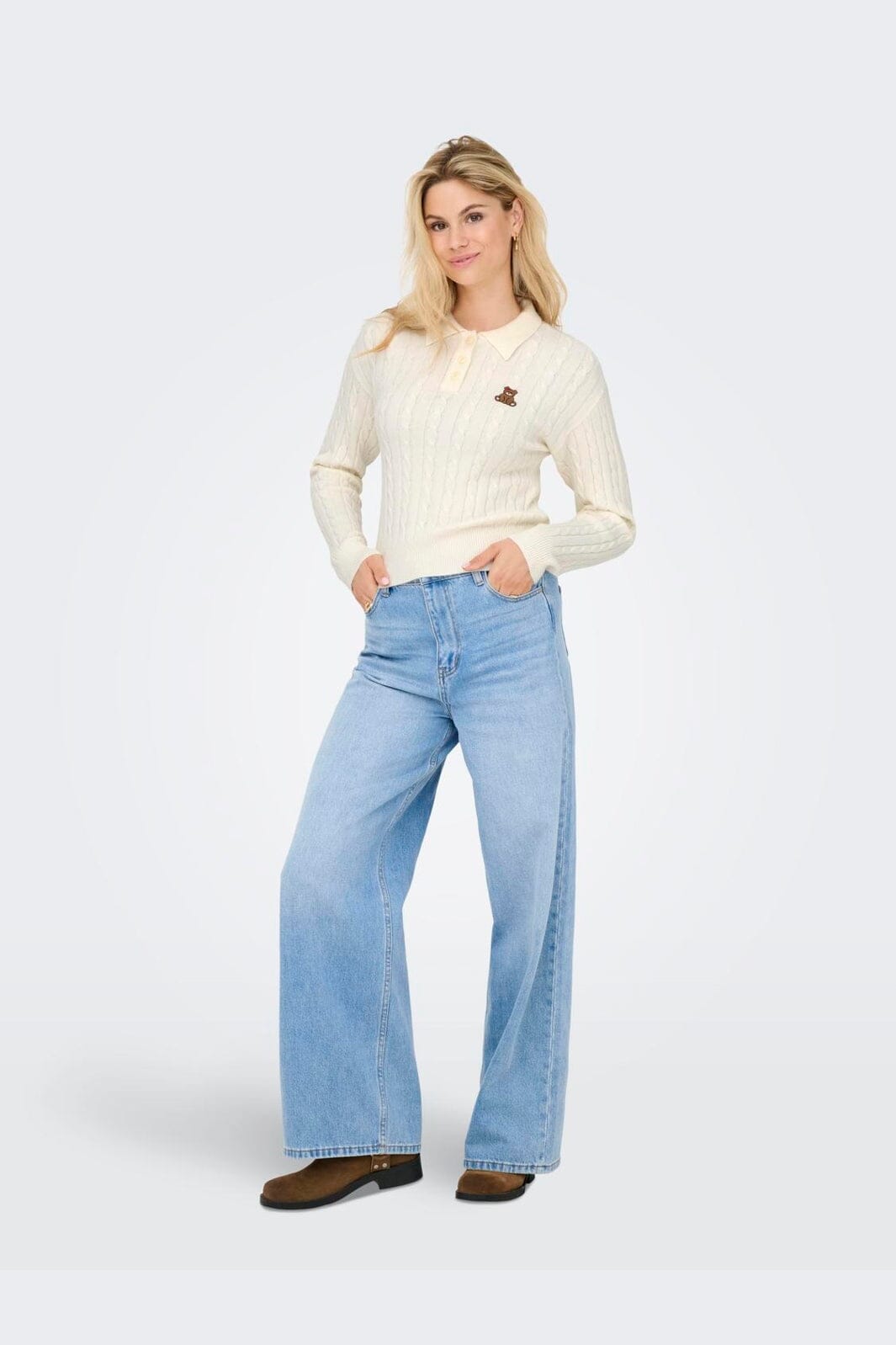 Stickad polo från Only i en ljus krämfärg. Tröjan har ett kabelstickat mönster och en broderad björnmotiv på bröstet.
