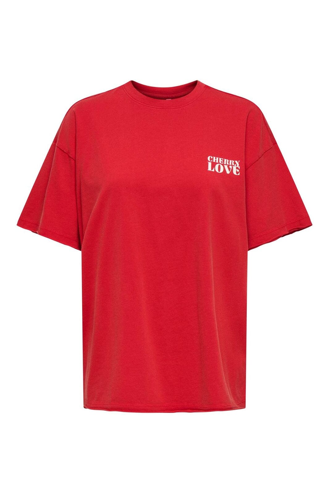 Röd oversized T-shirt från Only, tillverkad av 100 % ekologisk bomull. T-shirten har körsbärstryck och text på bröstet och ryggen.