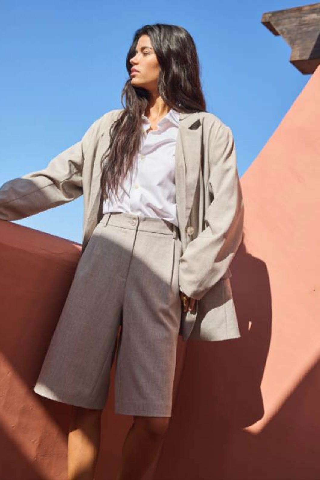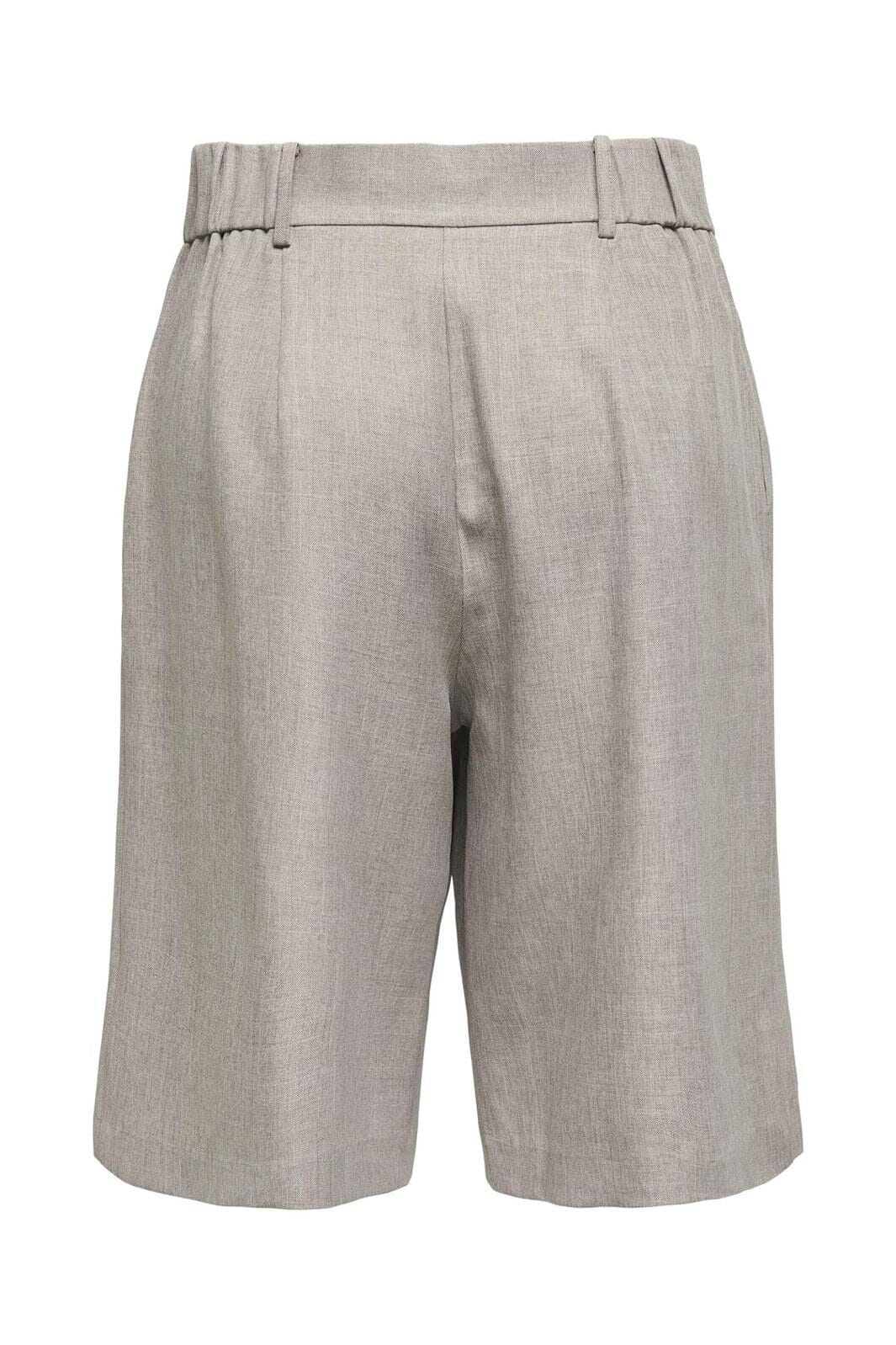 Knelånga bermudashorts i ljusgrå melange med hög midja och loose fit. Shorts har veck fram och praktiska sidofickor samt bälteshällor.