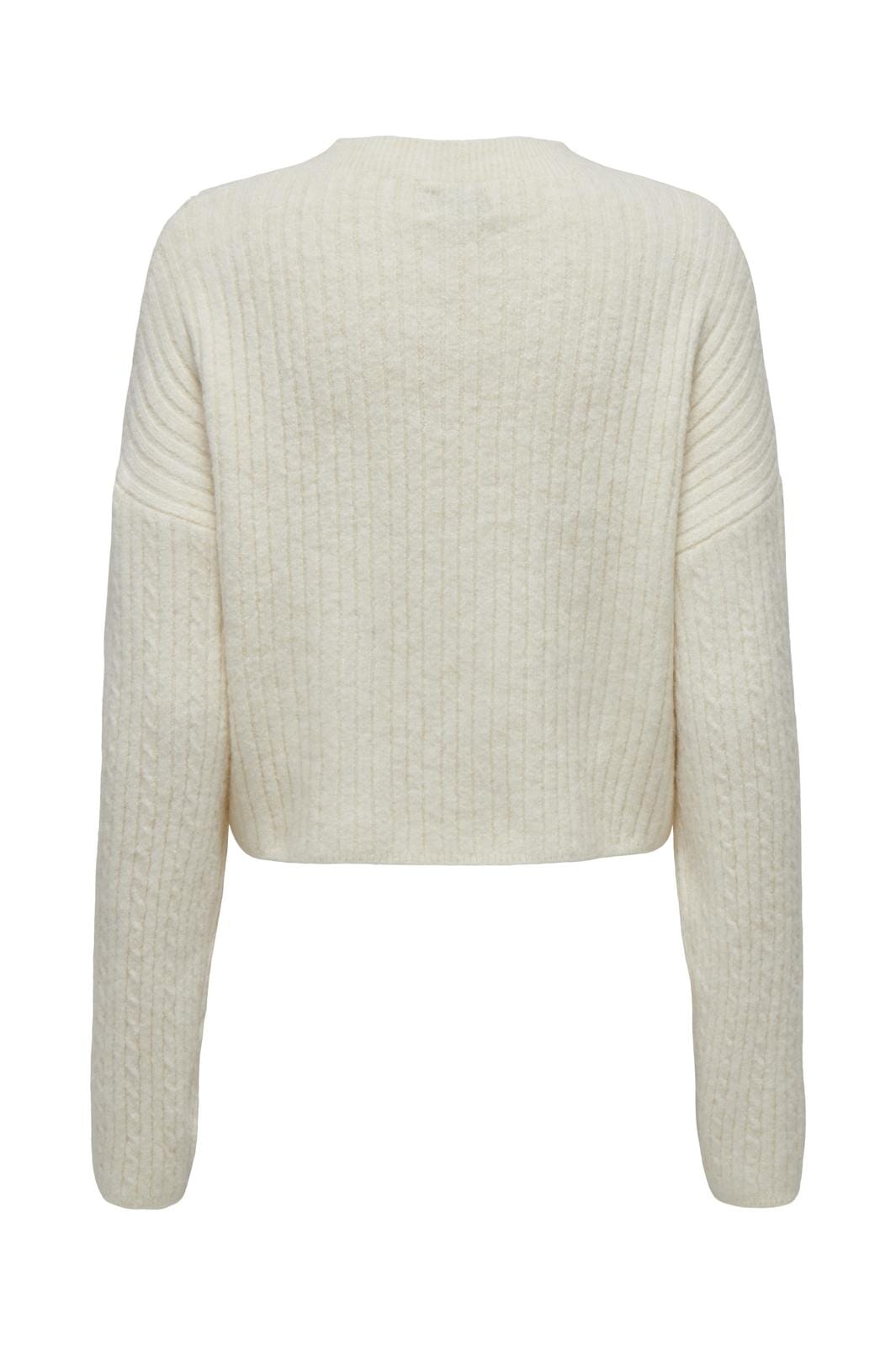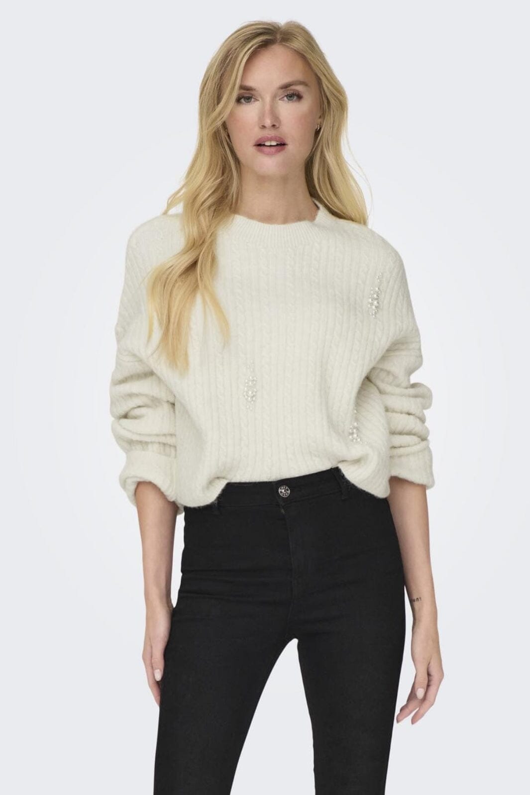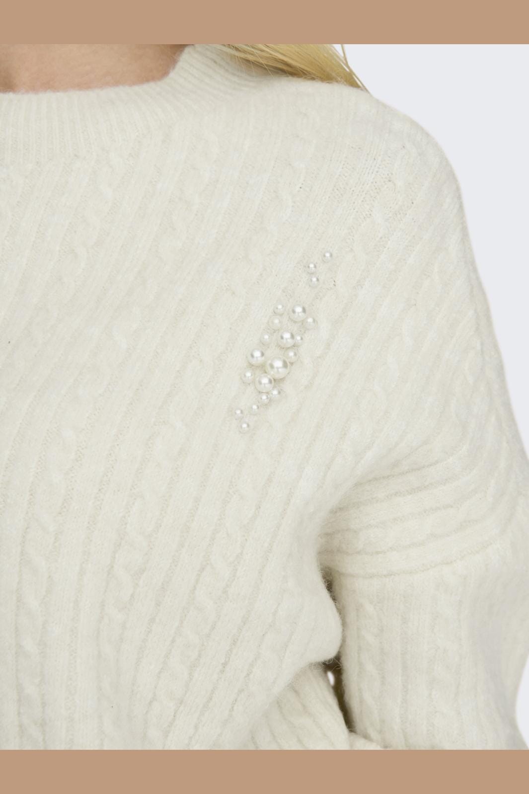 Vit stickad tröja från Only med ribbstickad struktur och kabelstickning. Tröjan har pärldetaljer på framsidan och en lös passform som ger god rörelsefrihet.