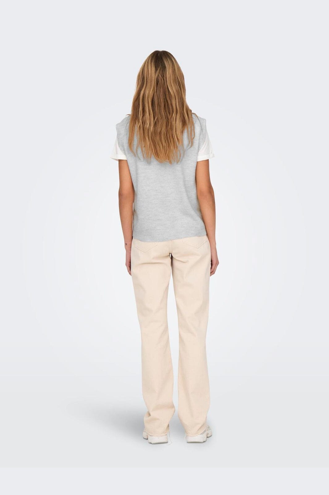 En stickad väst från Only i en ljusgrå nyans med broderade gyllene hjärtan. Väst med rund halsringning och ärmlös design med ribbade muddar.