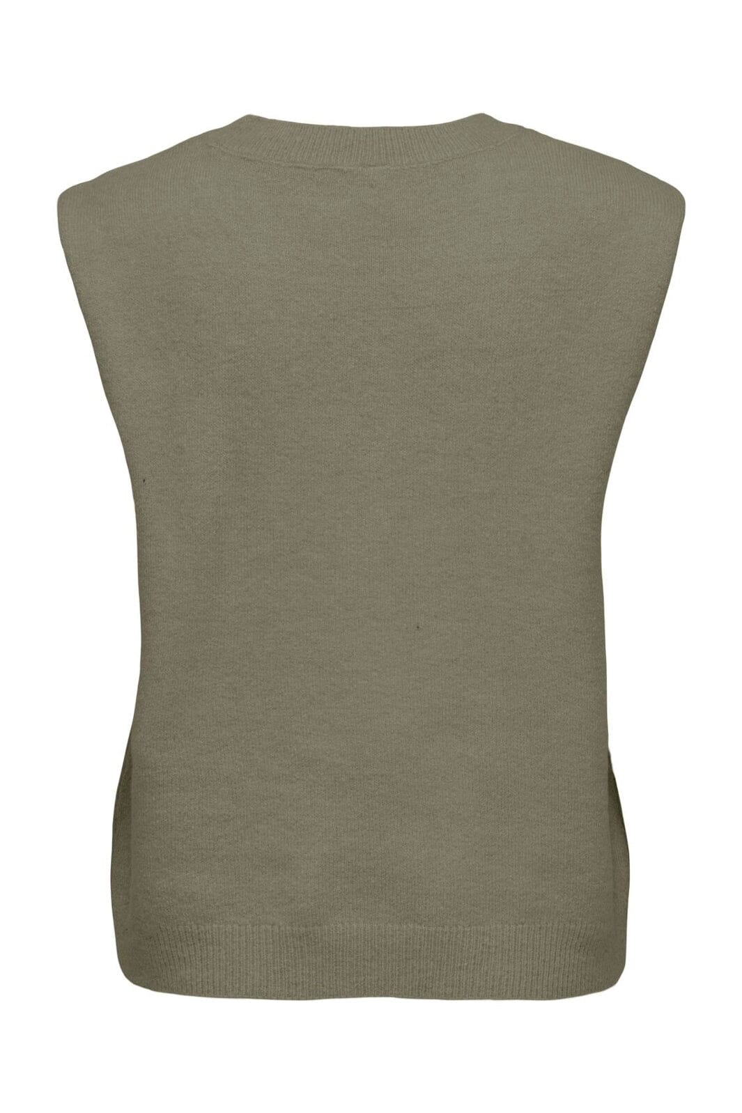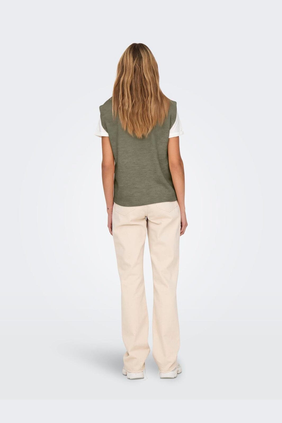 Ärmlös väst från Only i khakigrön färg med broderade gyllene hjärtan spridda över tyget. Västern har en rund halsringning och ribbade muddar.