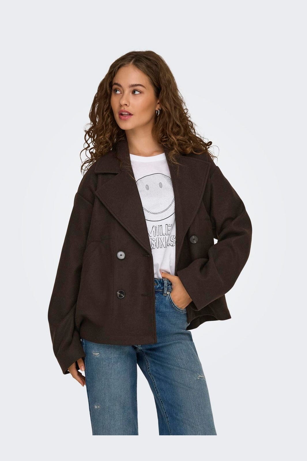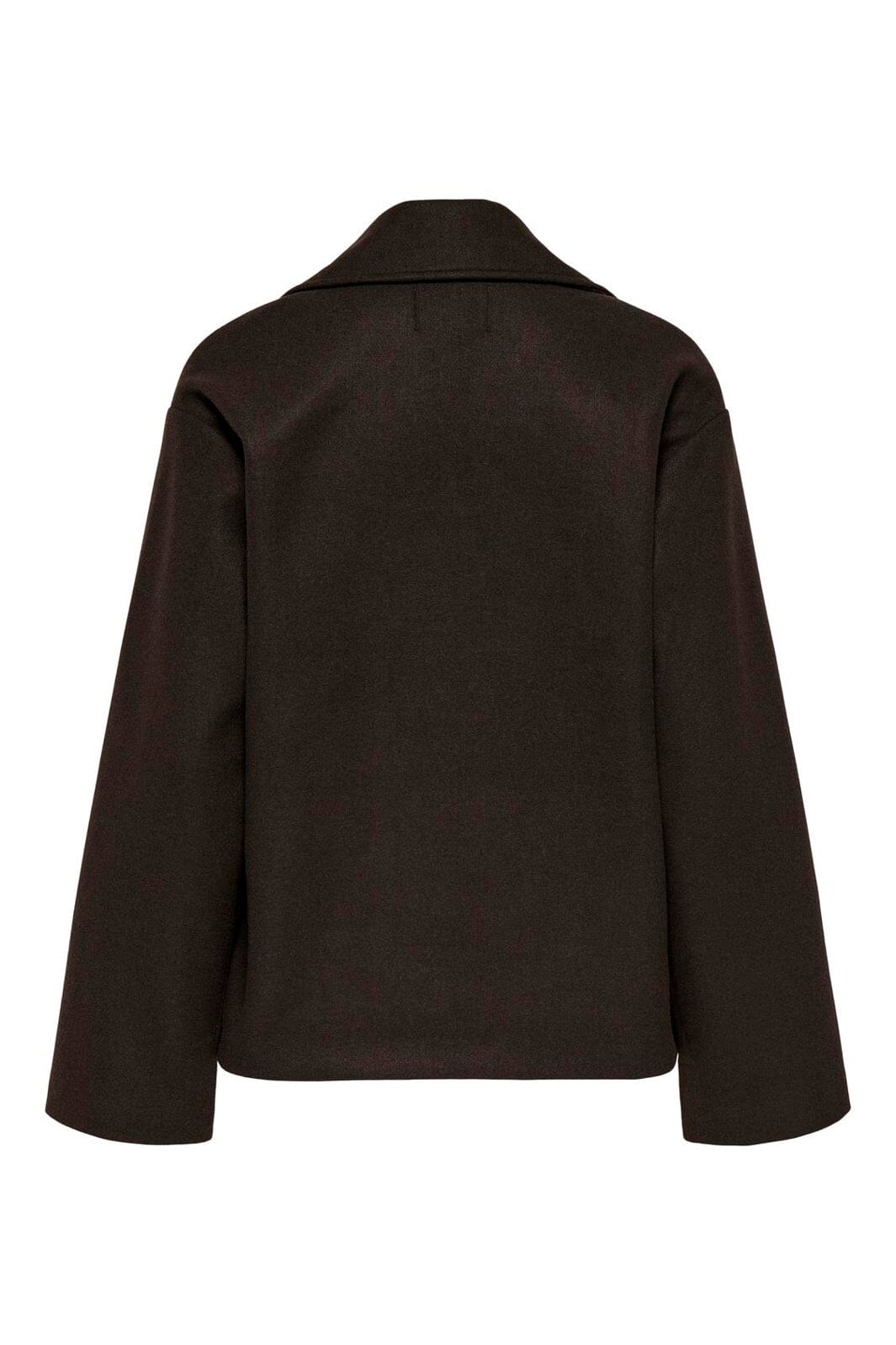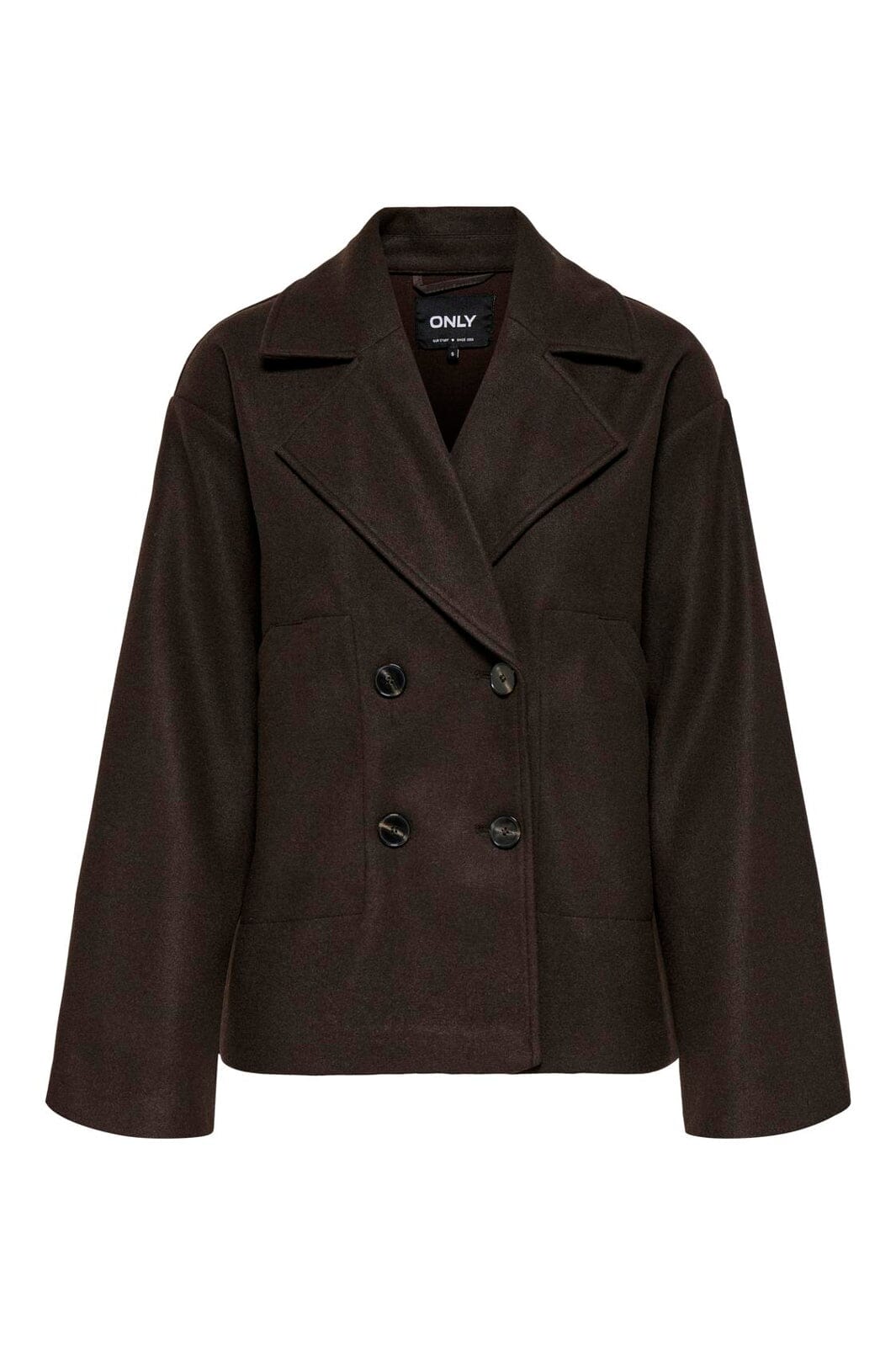 Mörkbrun jacka från Only med dubbelknappning. Den har en bred krage och långa ärmar som ger bra täckning. Sidofickorna gör jackan praktisk för vardagsbruk.