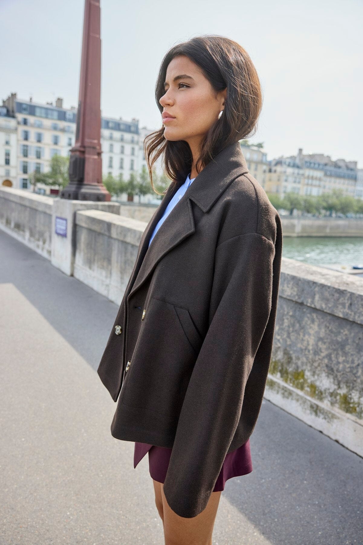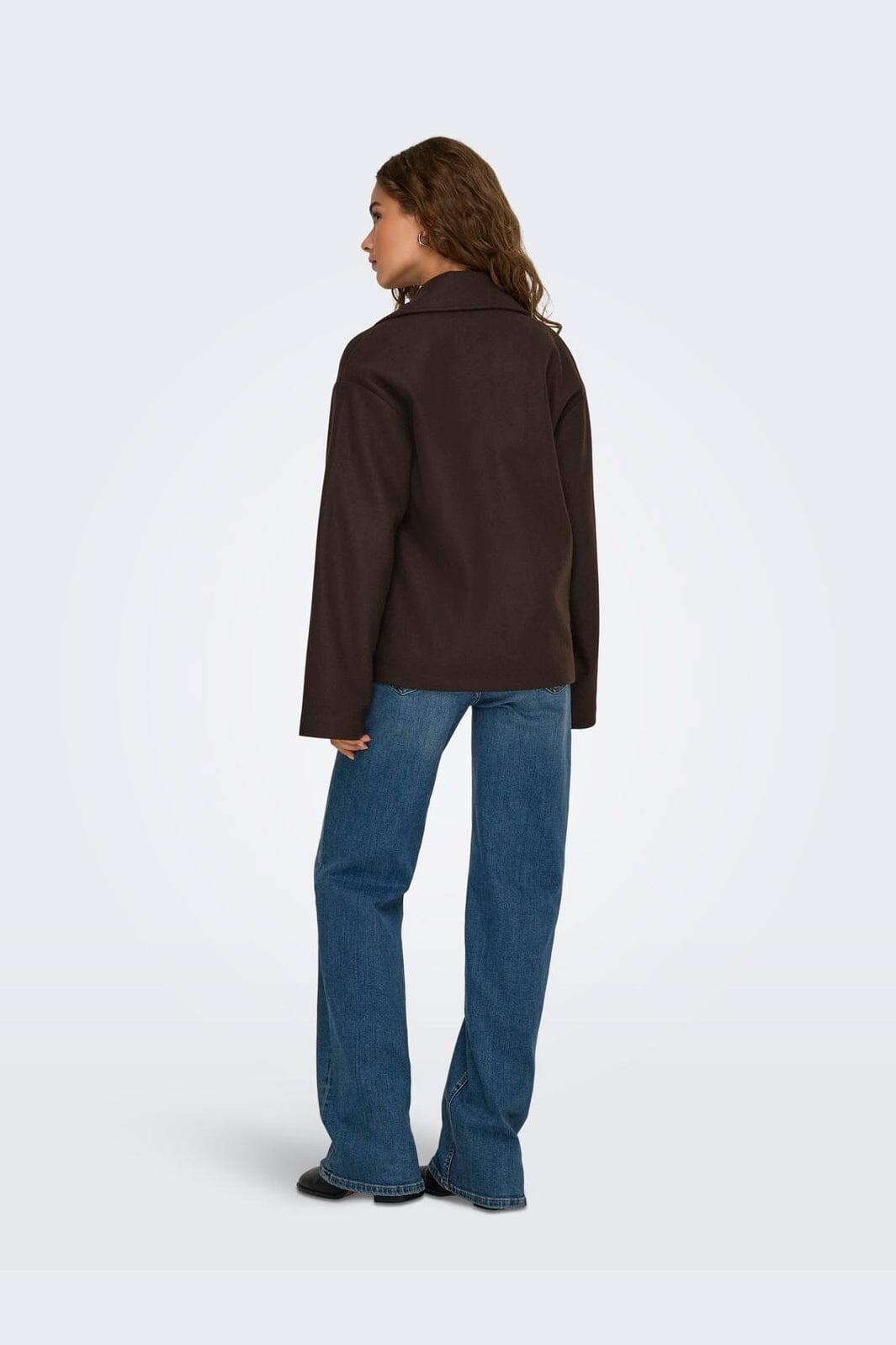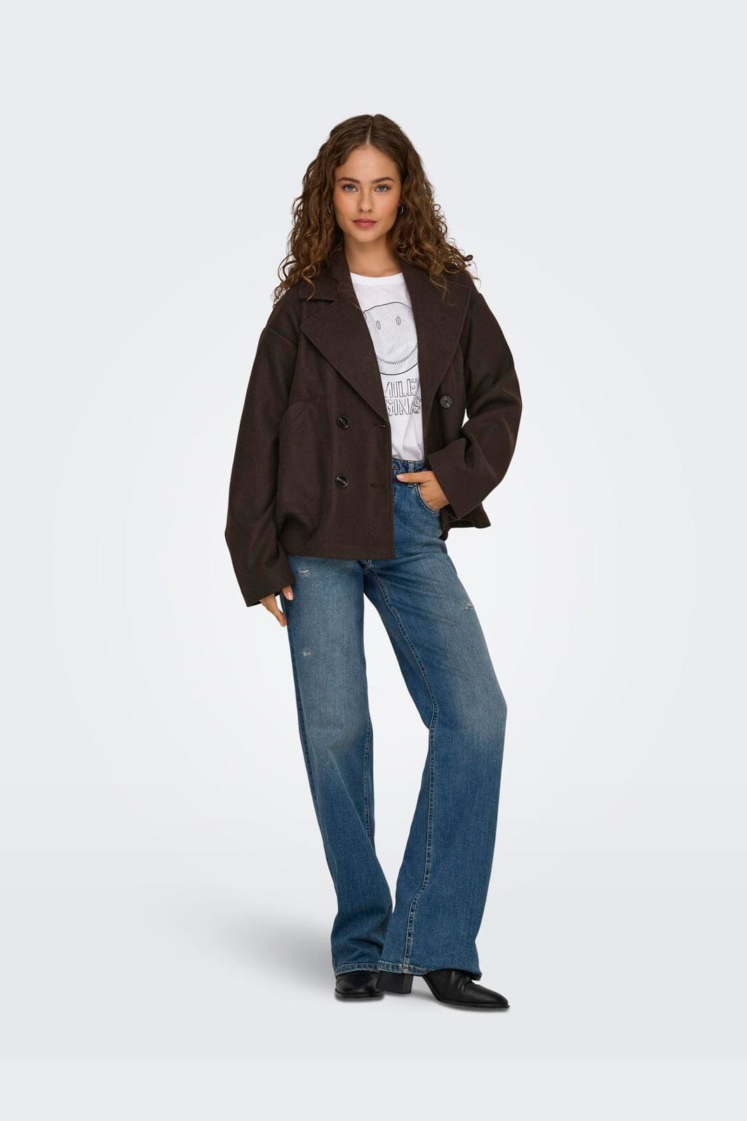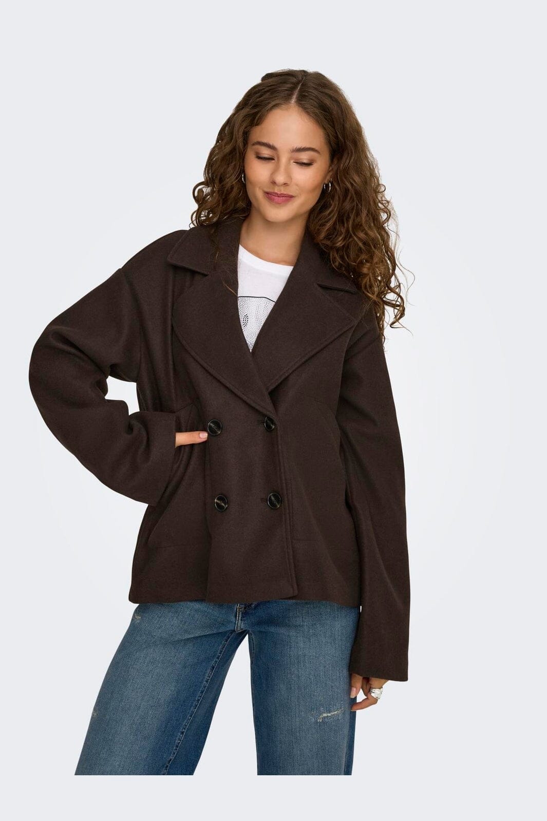 Mörkbrun jacka från Only med dubbelknappning. Den har en bred krage och långa ärmar som ger bra täckning. Sidofickorna gör jackan praktisk för vardagsbruk.