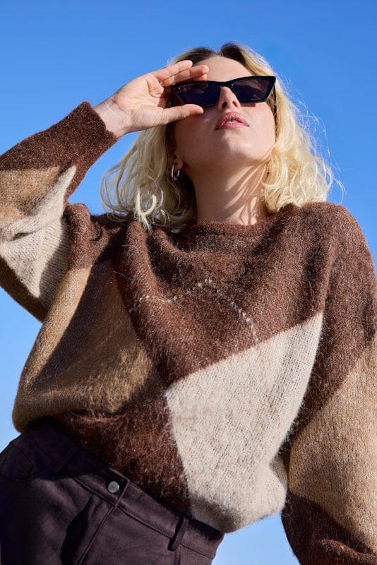 Stickad tröja från Only med ett argyle-mönster i bruna och beige nyanser. Tröjan har en rund halsringning och långa ärmar.