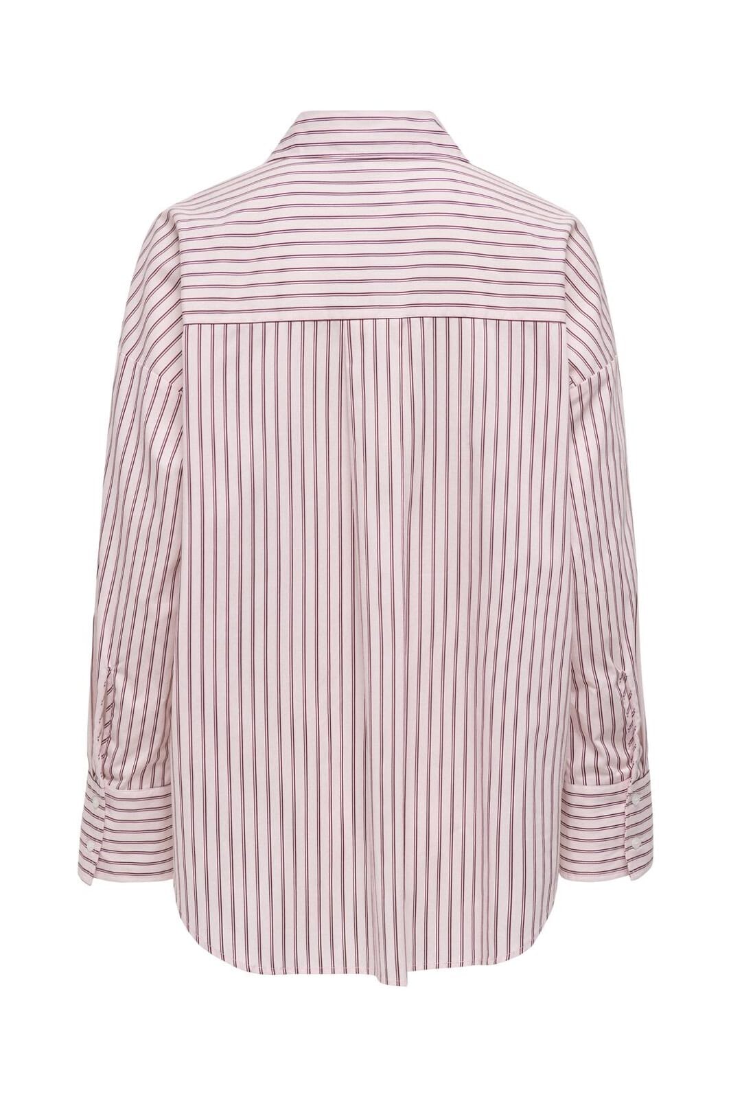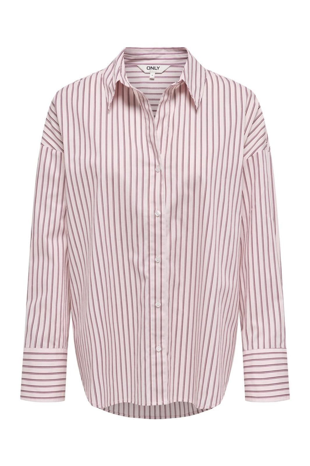 Randig skjorta från Only i fuchsia rosa och bordeaux på vit bakgrund. Skjortan har klassisk krage, långa ärmar och knapplåsning hela vägen ner.