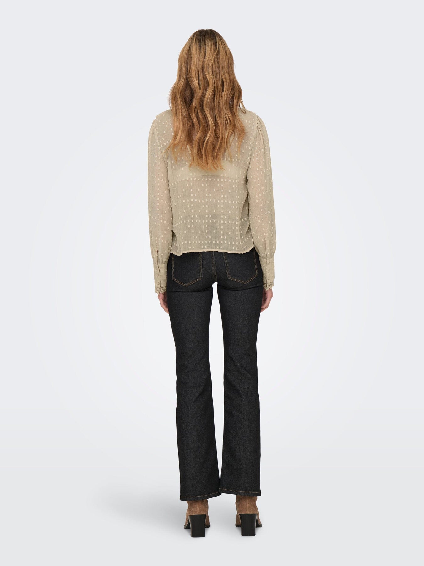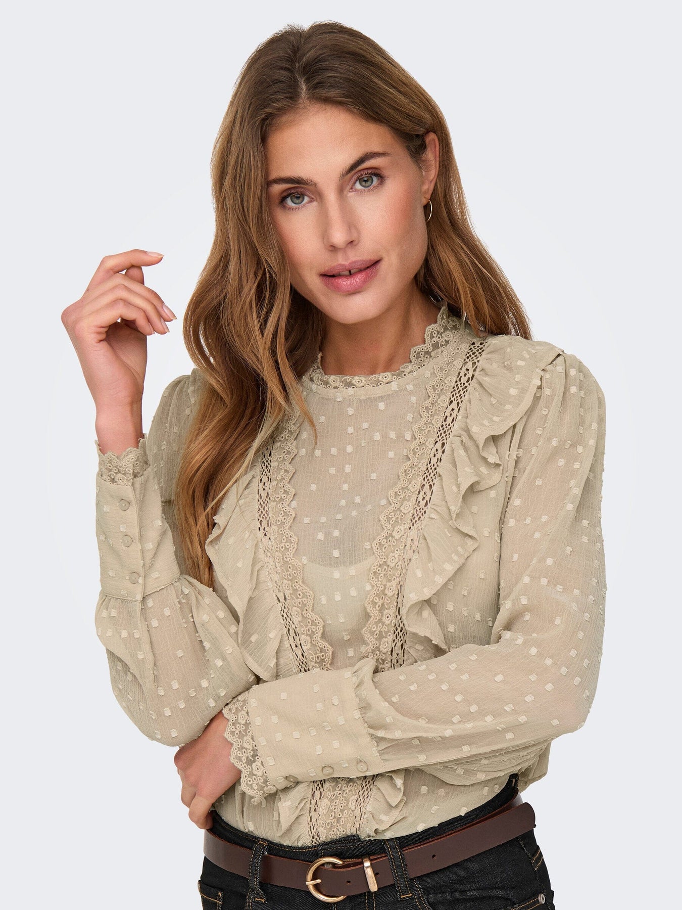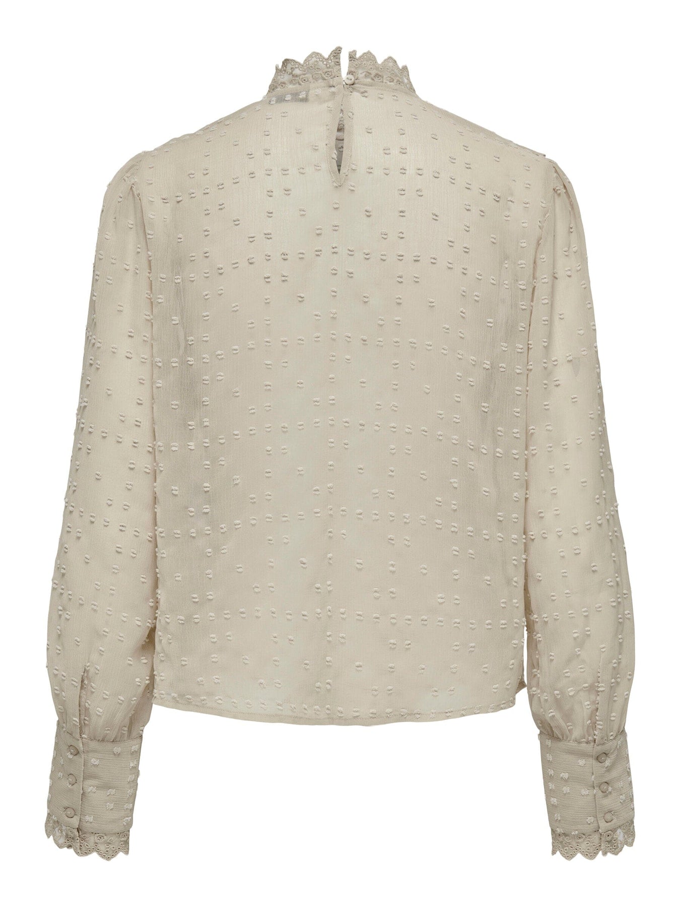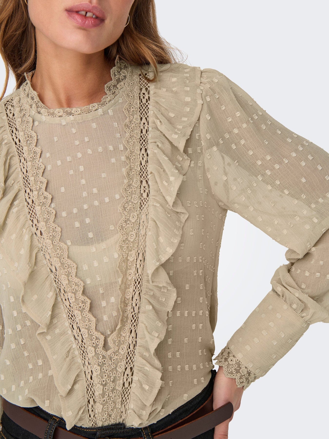 Beige blus från Only med dobby-struktur i tyget. Blusen har volangdetaljer längs halsringningen och långa ärmar med spetskant. Rund hals och knappar fram.