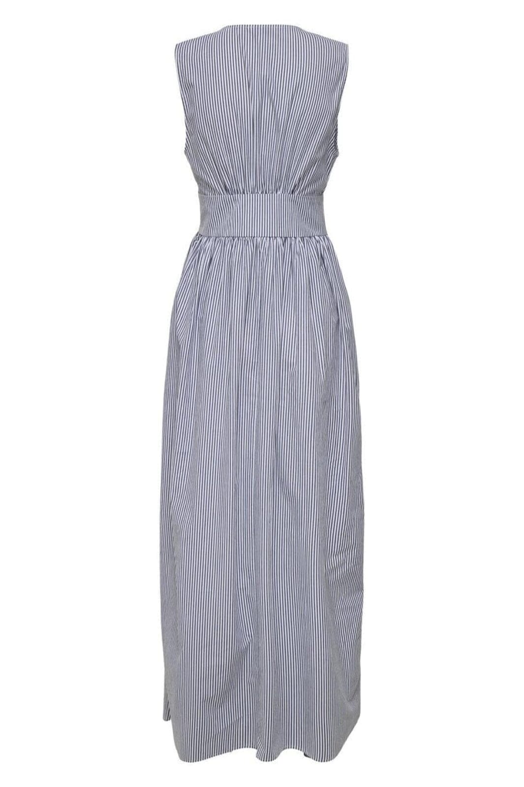 Lång klänning från Only med vita och mörkblå ränder. Klänningen har V-ringning och knytdetalj i midjan som ger möjlighet att anpassa passformen.