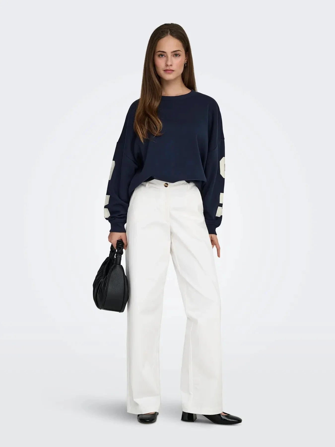 Mörkblå sweatshirt från Only med tryck på ärmarna och ryggen. Sweatshirten har en lös passform och rund halsringning.