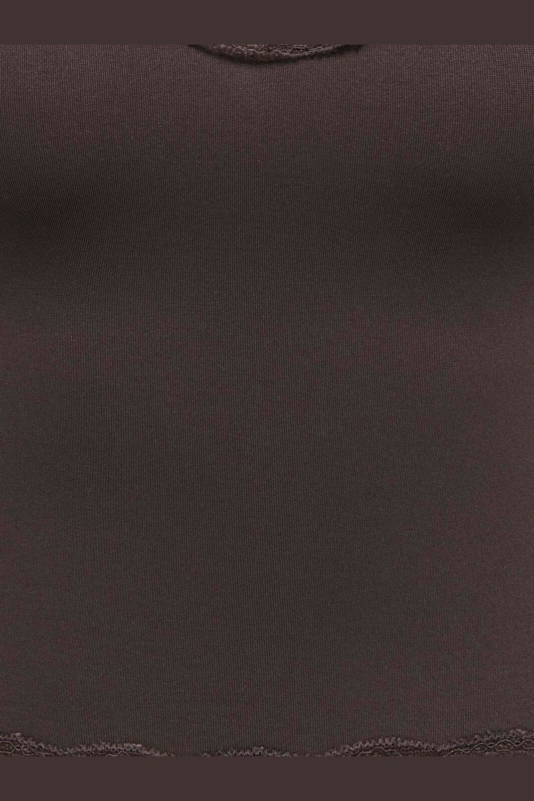 Brun cropped topp från Only med spetskanter. Toppen har en V-ringning och är gjord i ett mjukt, stretchigt material med fina spetsdetaljer längs kanterna.