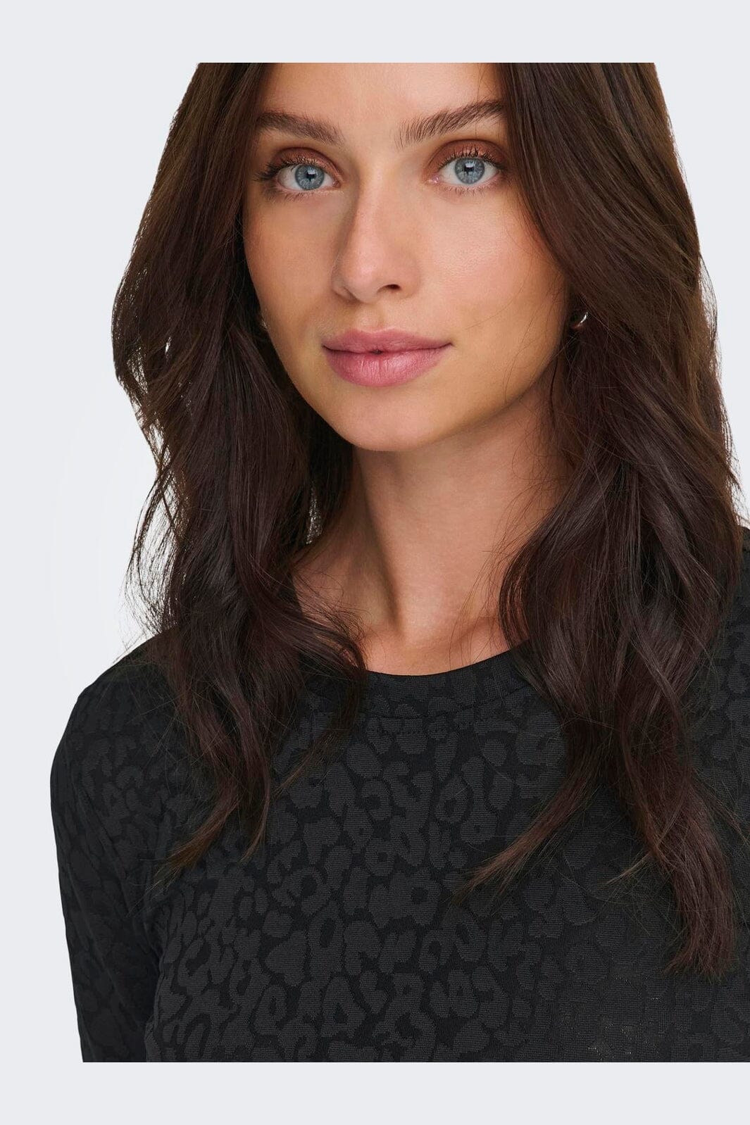 Svart långärmad topp från Only med rund hals och leopardmönster. Toppen har en kroppsnära passform och är tillverkad i en mjuk kvalitet med stretch, vilket gör den bekväm att ha på sig.