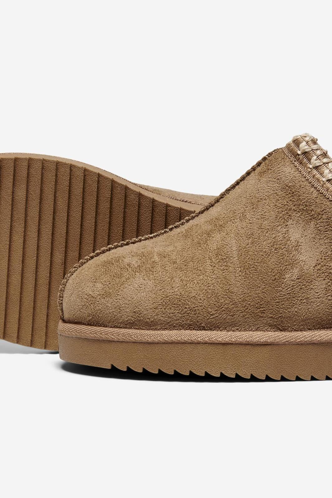 Inomhusskor från Only i cognacfärgad syntetisk mocka. Den mjuka skon har ett varmt teddyfoder och dekorativa sömmar längs kanten.