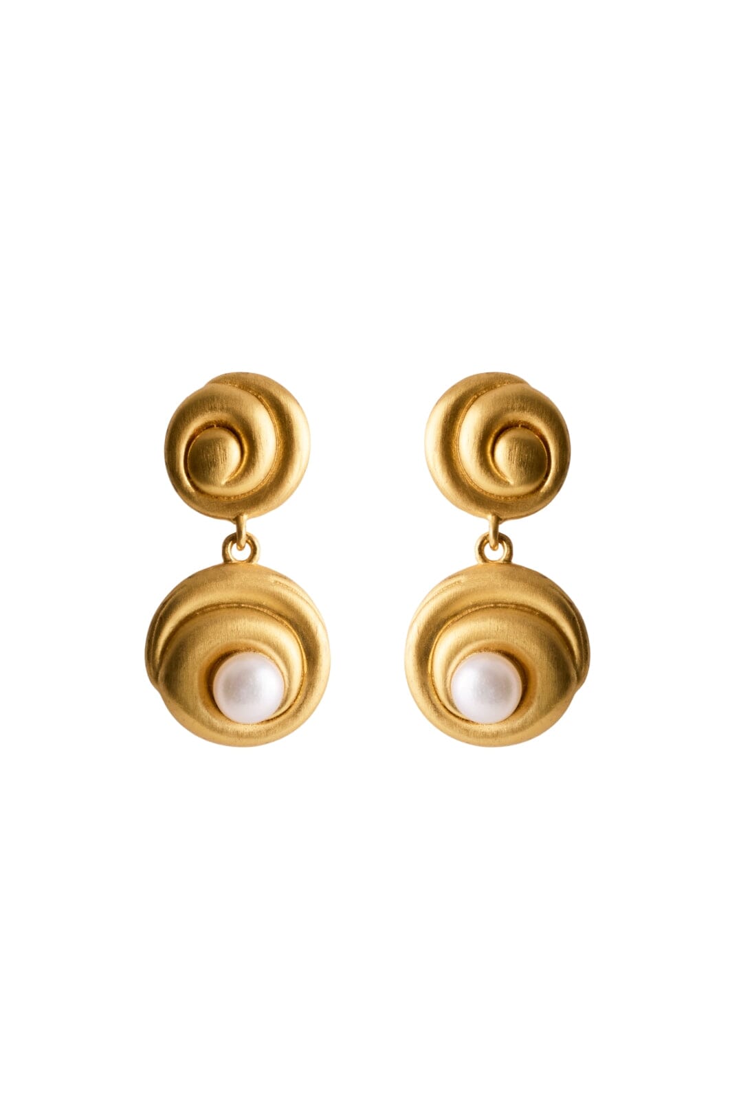 Shell Flower-örhängen från Pernille Corydon Jewellery med en spiralformad snäckdesign och pärldetalj. De lätta örhängena har en glänsande, guldbelagd yta.