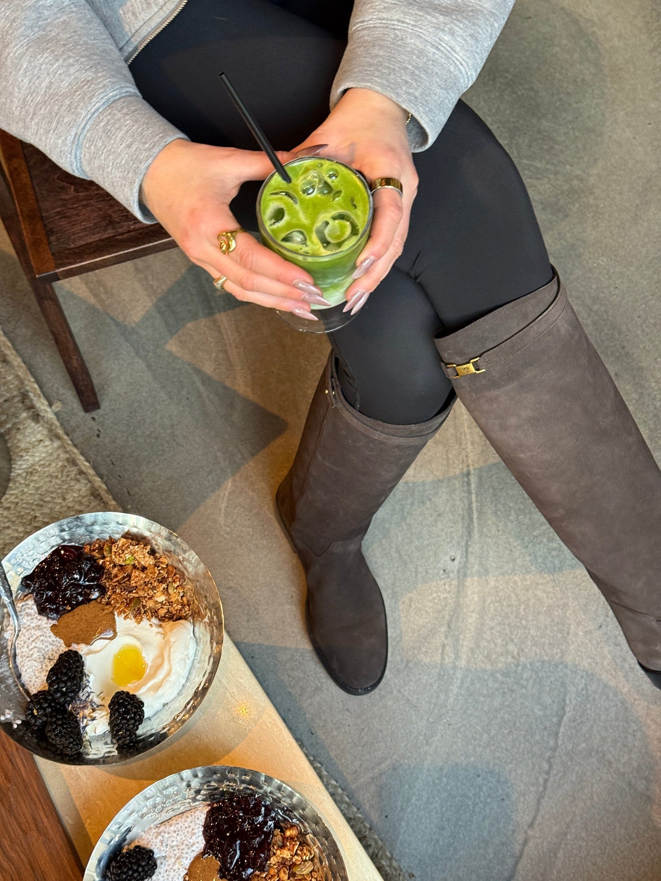 Knälånga stövlar från Phenumb Copenhagen, tillverkade av mocka i en mörkbrun nyans. Stövlarna har en flat svart sula och ett litet guldfärgat spänne upptill.