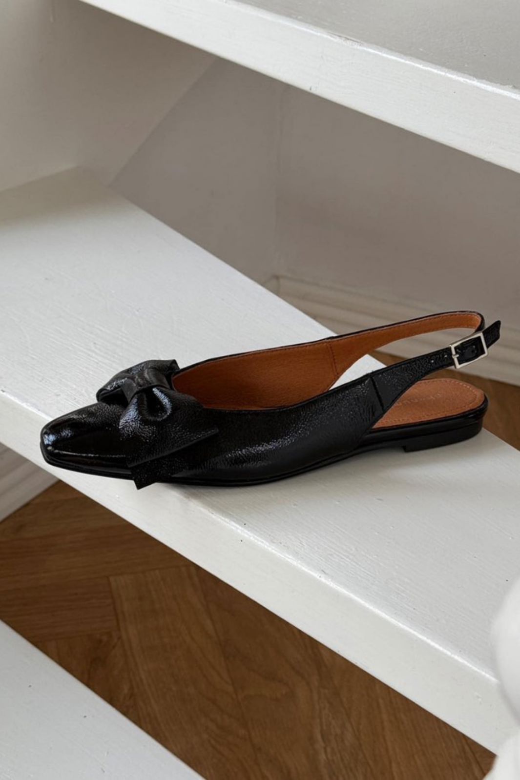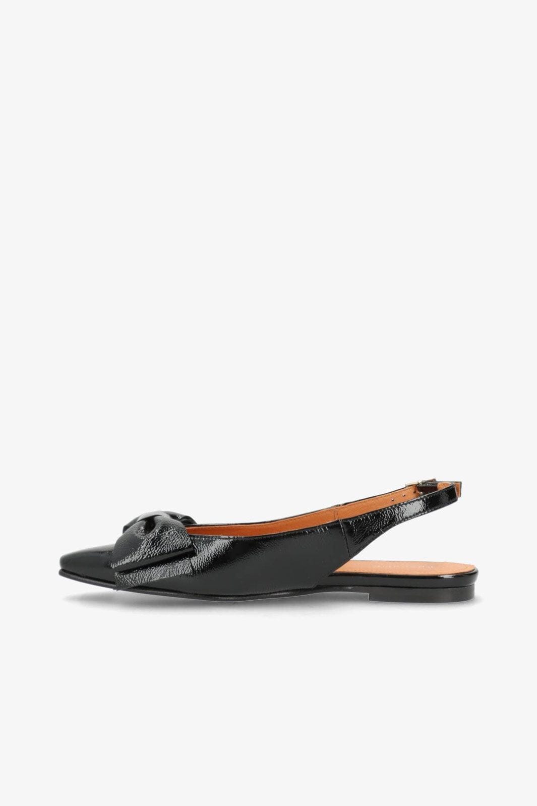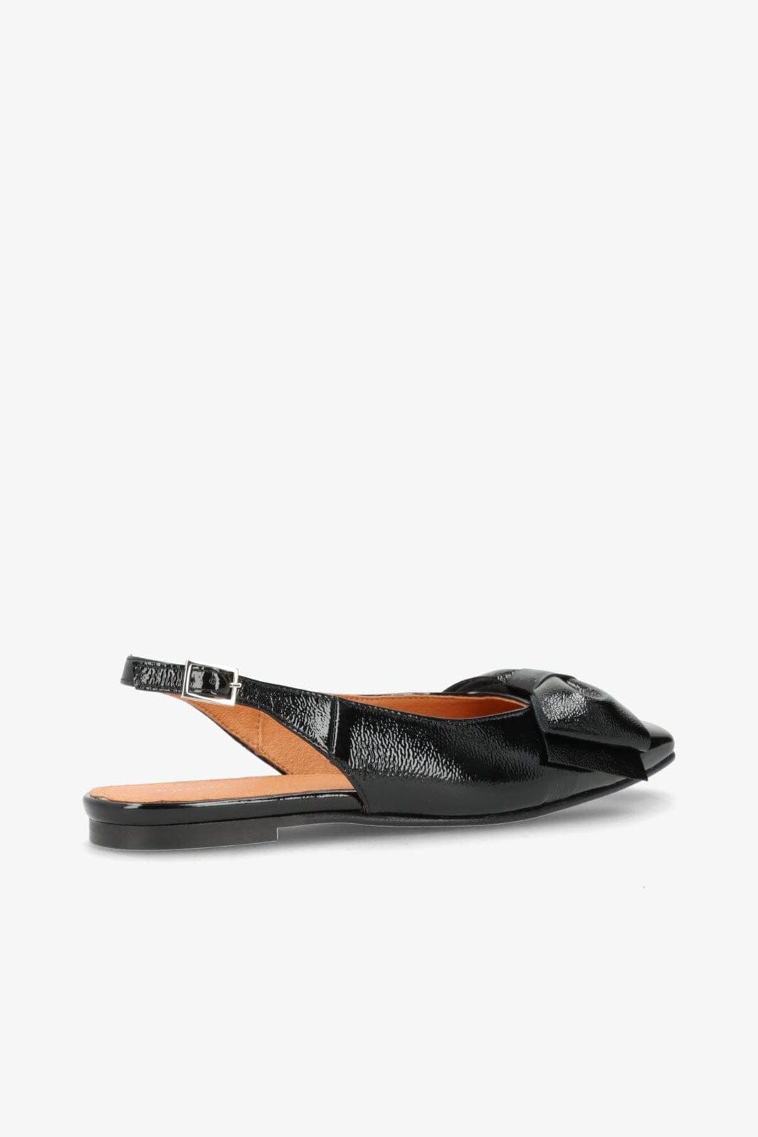Svarta ballerina-skor från Phenumb Copenhagen med spetsig tå och rosett på framsidan. Skorna har en glänsande lackläderyta som ger ett fint uttryck.