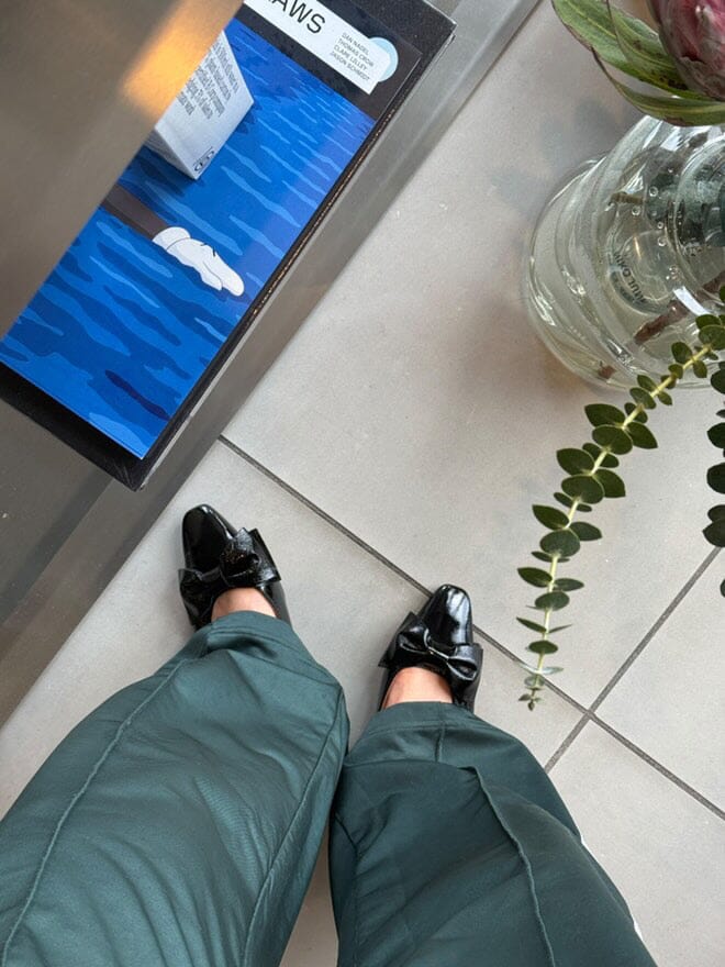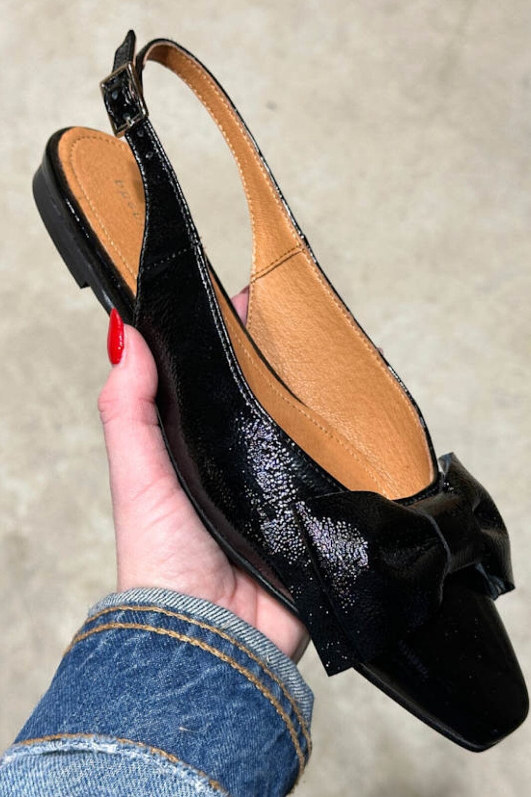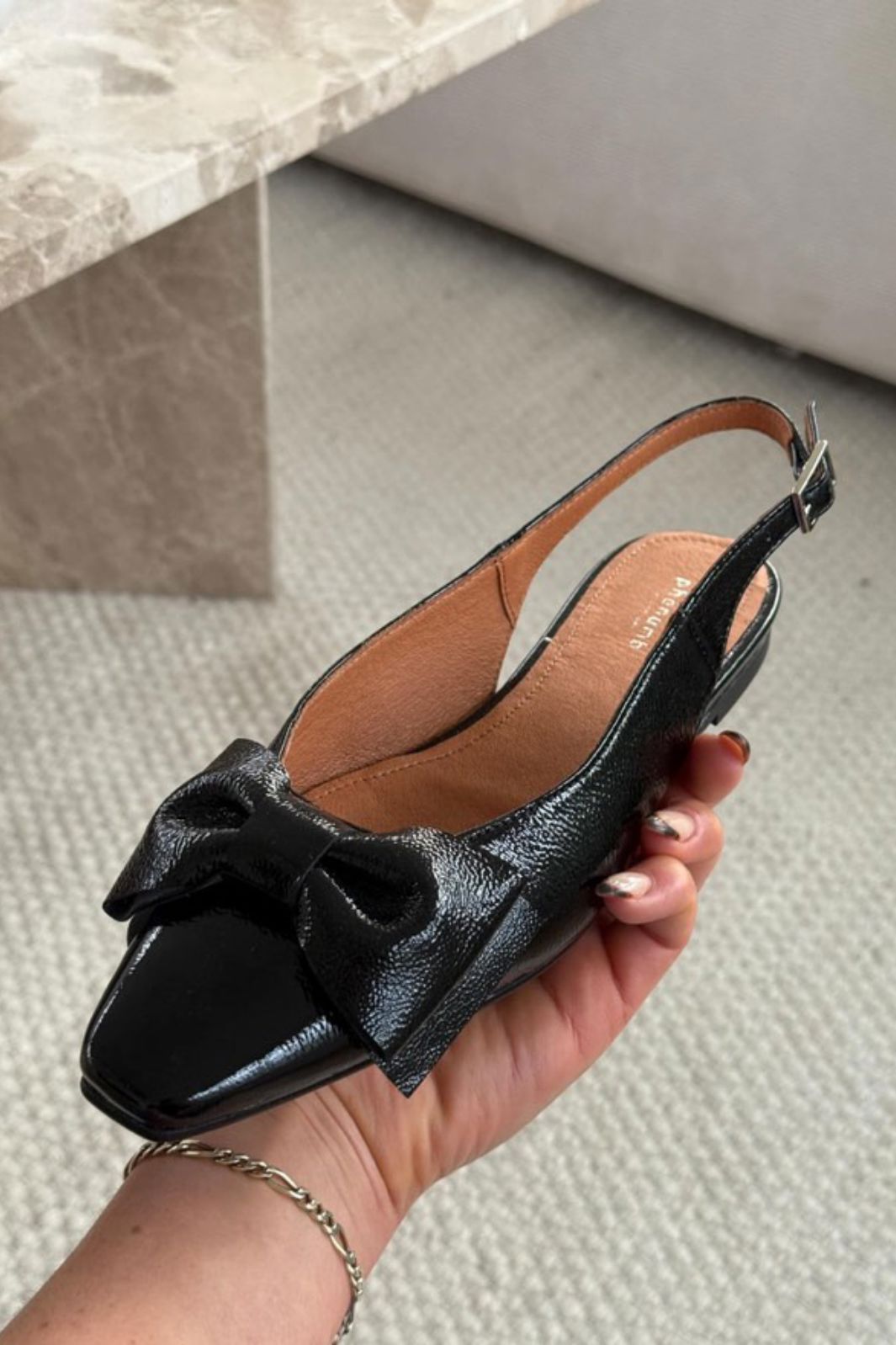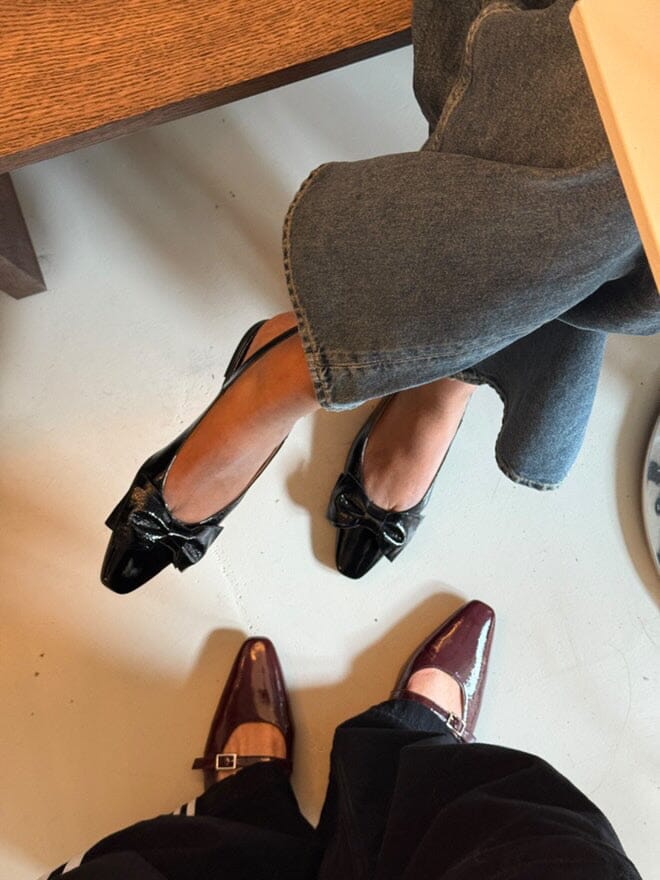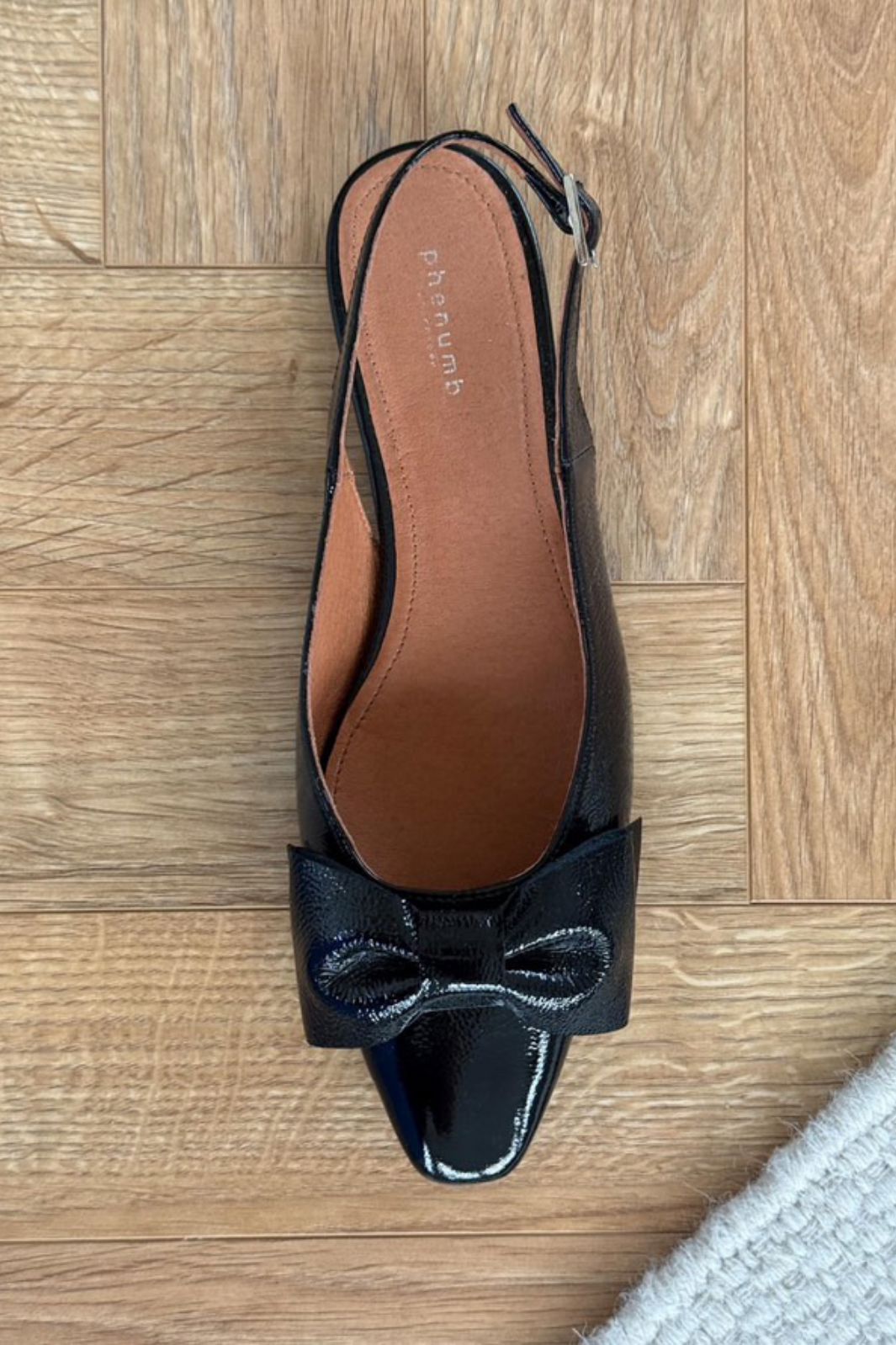 Svarta ballerina-skor från Phenumb Copenhagen med spetsig tå och rosett på framsidan. Skorna har en glänsande lackläderyta som ger ett fint uttryck.