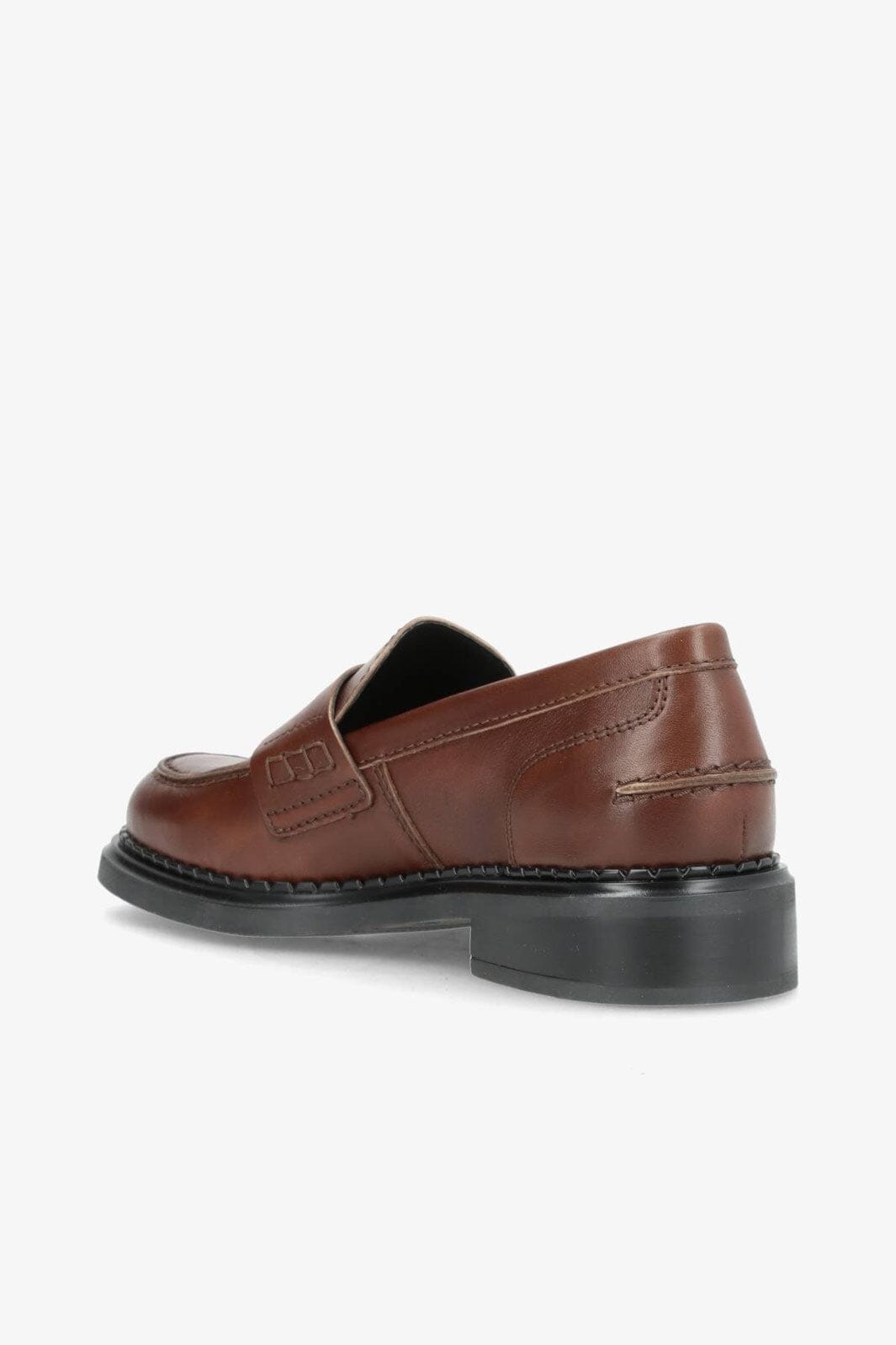 Brun loafer från Phenumb Copenhagen i tvättat läder med fyrkantig tå. Skon har en låg blockklack och dekorativa sömmar längs kanten.