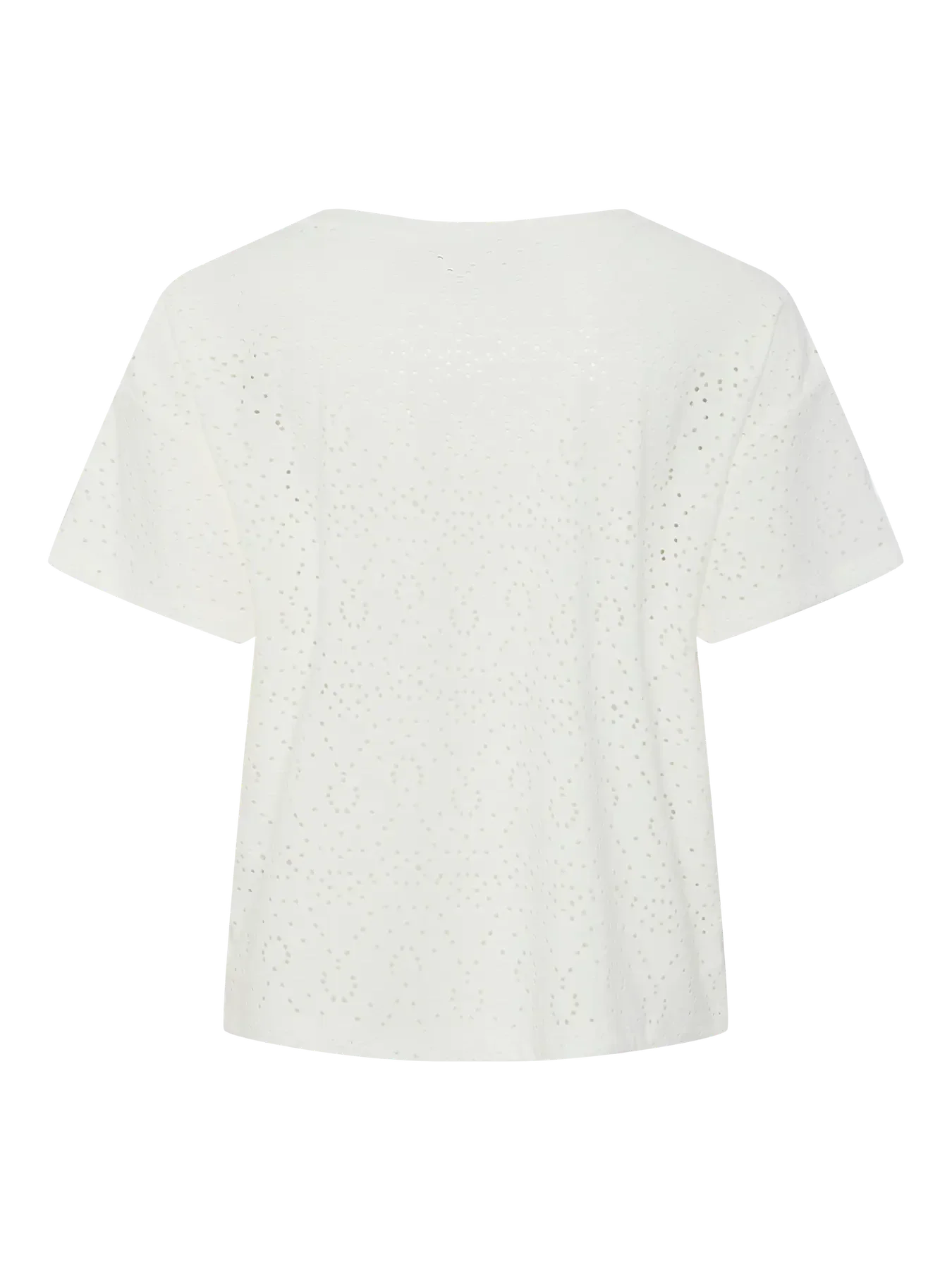 Vit T-shirt från Pieces med broderie anglaise-mönster. Materialet har genomgående utskärningar som ger T-shirten ett dekorativt uttryck. Korta ärmar med sänkta axelsömmar och en rund halsringning.