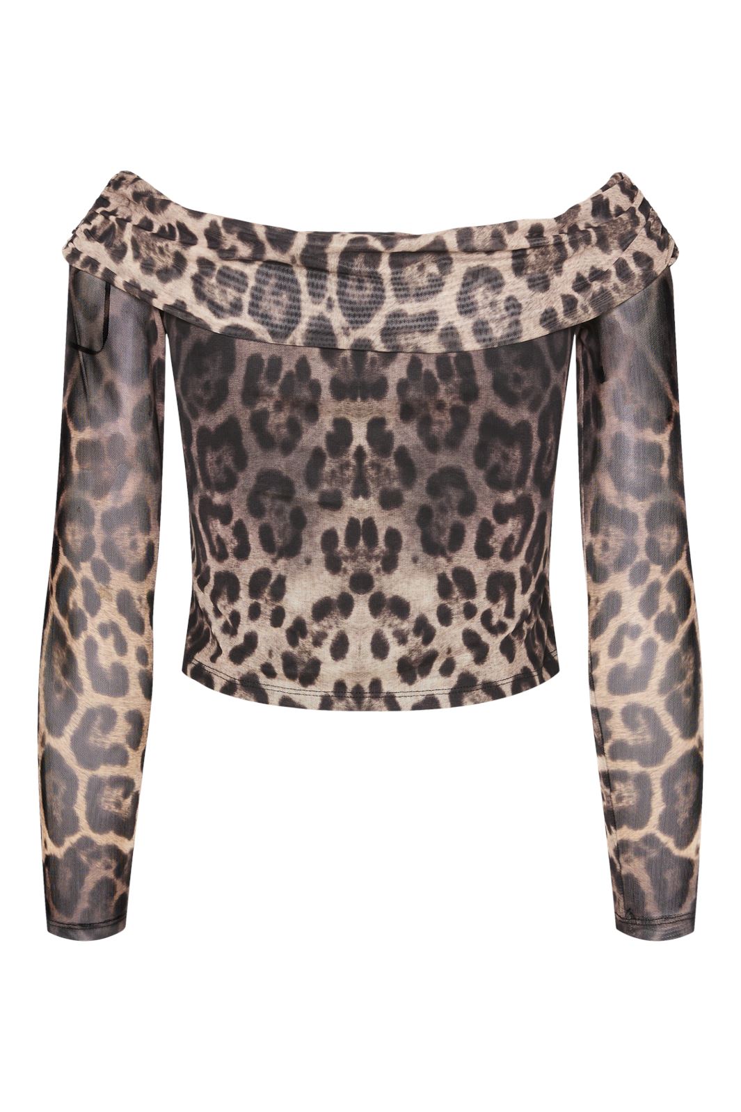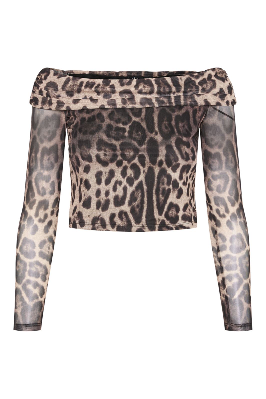 Off-shoulder topp från Pieces med svart och beige leopardmönster. Toppen har långa genomskinliga ärmar och en regular passform som ger god rörelsefrihet.