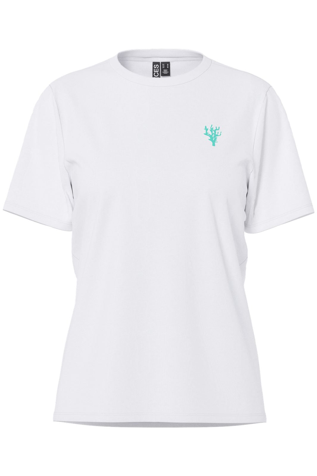Vit t-shirt från Pieces med turkosa havsväxttryck på framsidan. Baksidan har en större grafisk design med texten Amalfi Coast och havsväxtmotiv i turkos och rosa.