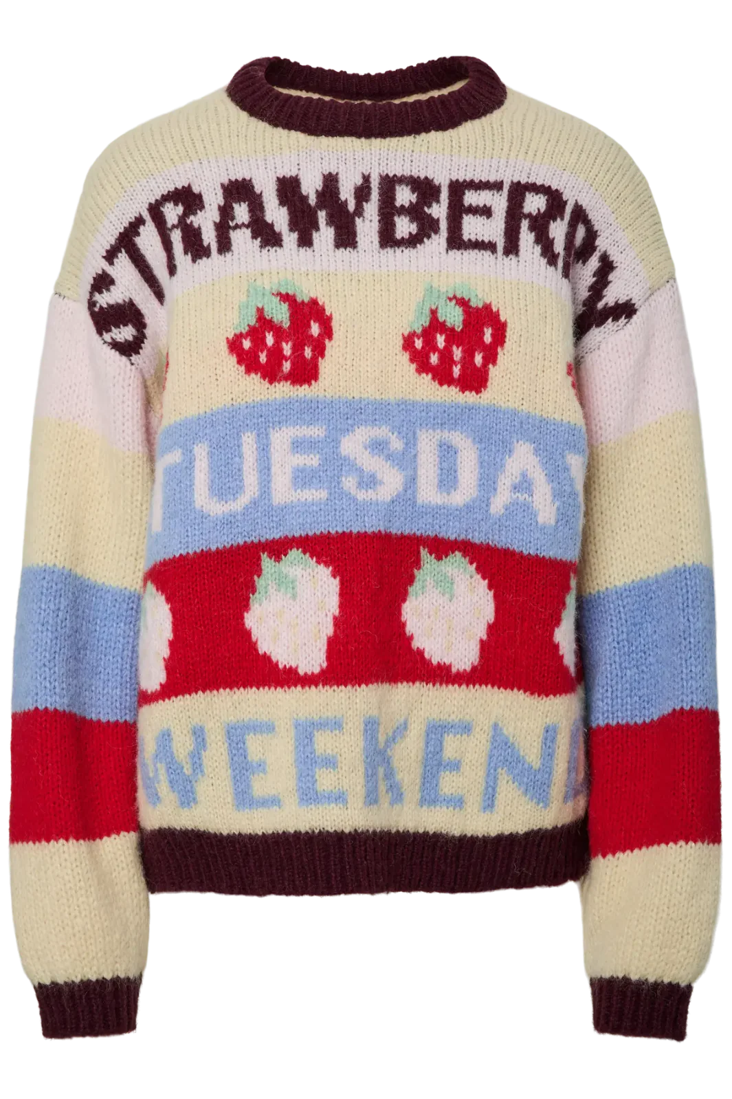 En flerfärgad stickad tröja från Pieces med grafiska element och text. Tröjan har en beige bas med ränder i rött, blått och brunt.