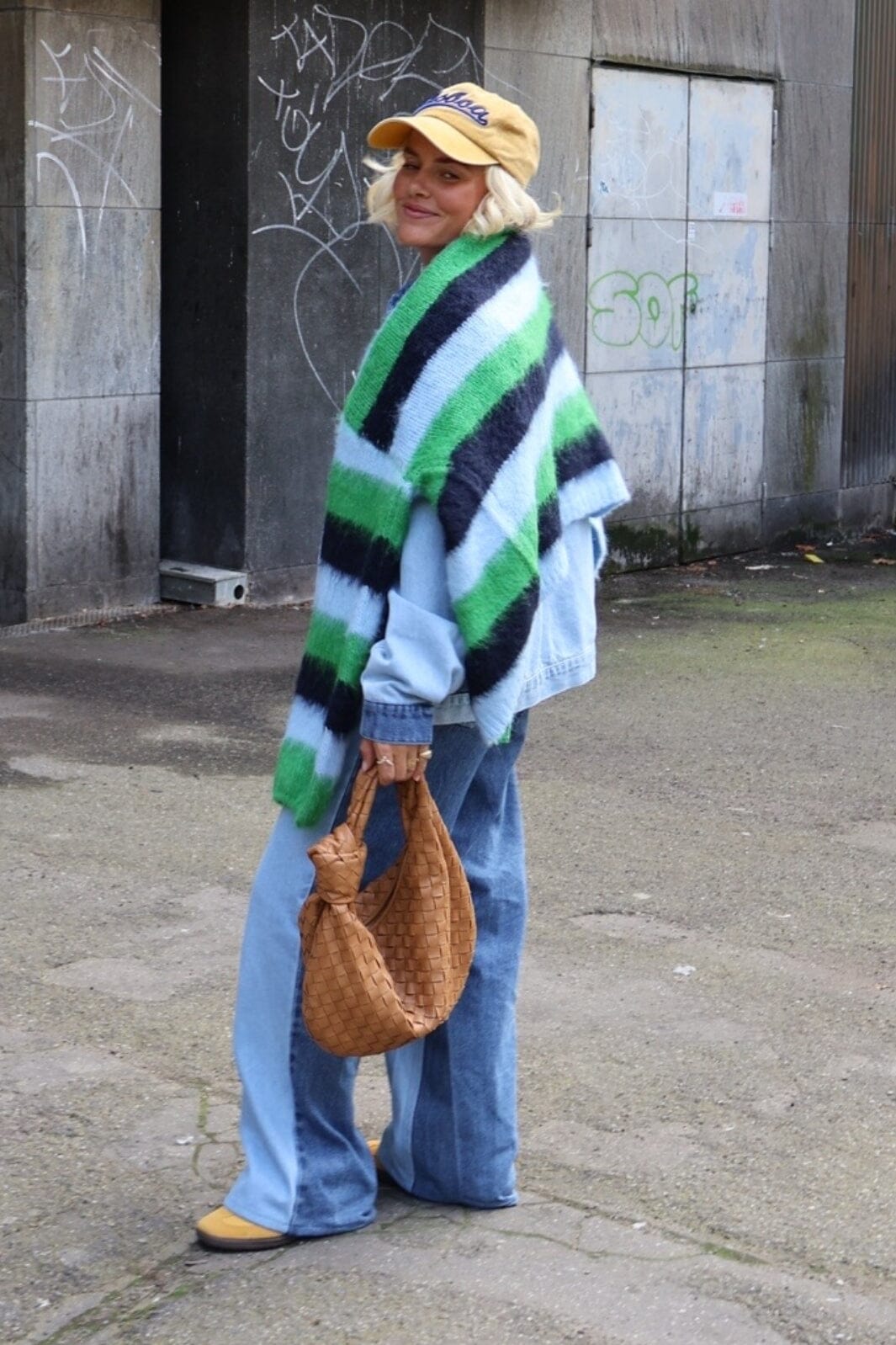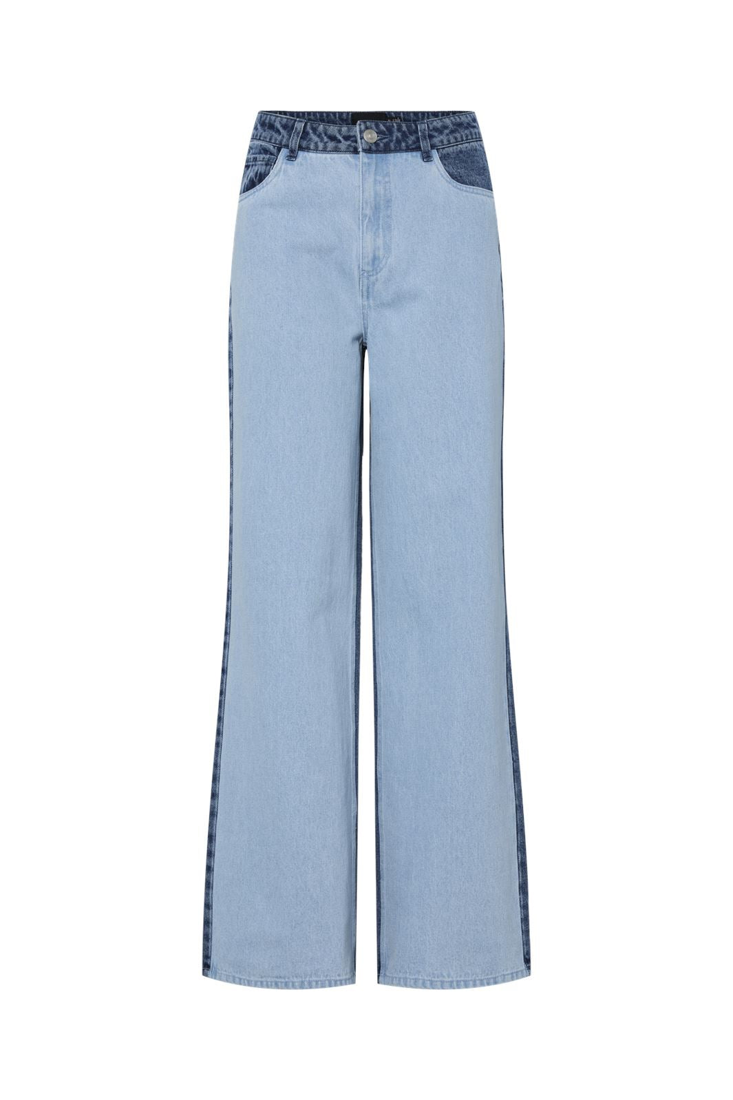 Breda jeans från Pieces med en karakteristisk färgblockeringsdesign i ljus och mellanblå denim. Den höga midjan och breda benen skapar en avslappnad silhuett.